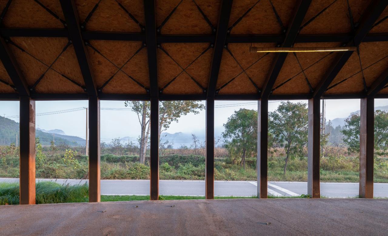 这座亭阁状建筑体与周边的自然草木相互渗透,所用的材料亦源于自然:顶部,木屋瓦作为乡建的常用材质,奠定建筑「质朴」的基调;中部,麦秸杆压成的板材不经粉饰,与钢结构系统共同暴露,竹制的吊灯悬于其下,回应田园的温润;底部,木制的市集摆台可依循功能灵活布置,或散或合、或高或低,融于场地和场景。