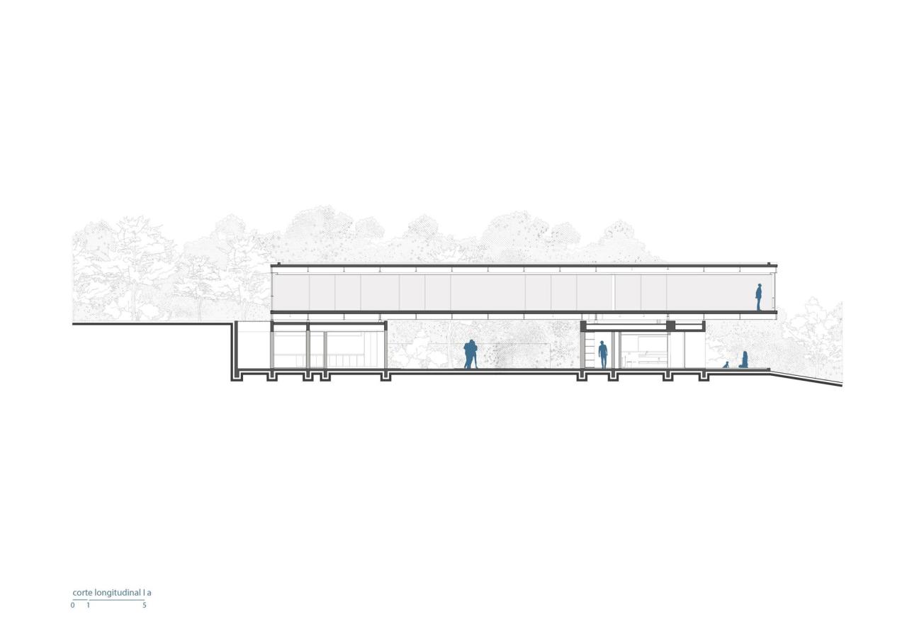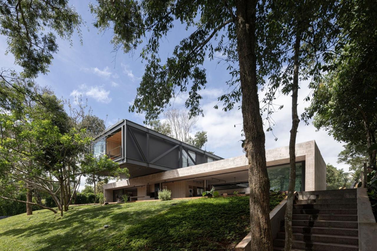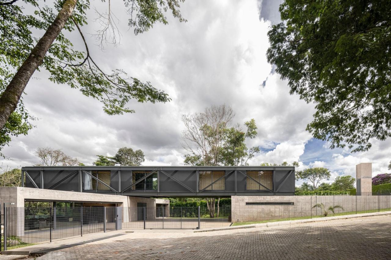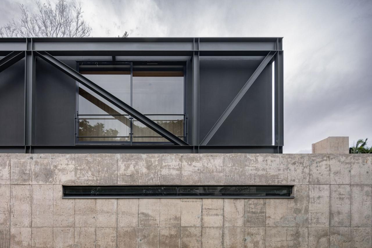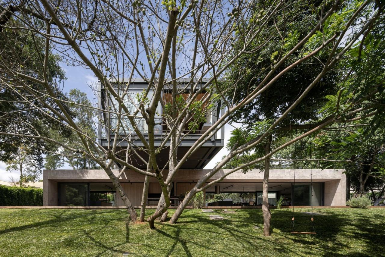 悬浮在坚实的混凝土平台基础之上,一个由钢元素构成的空中亭子巧妙地落在上面。悬臂朝向茂盛的自然景观,这个金属部件容纳了住宅项目的私密部分,以及所有的卧室。