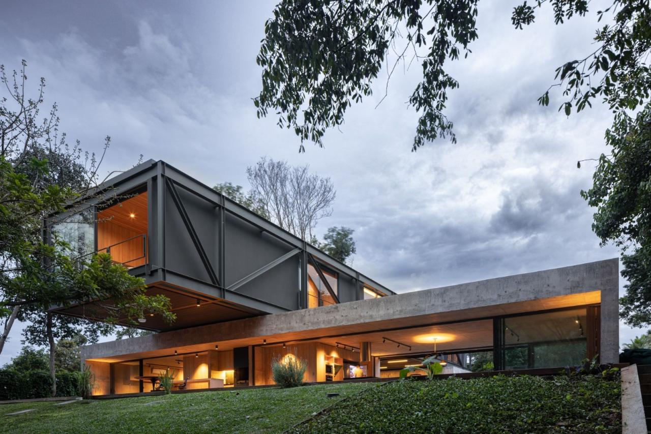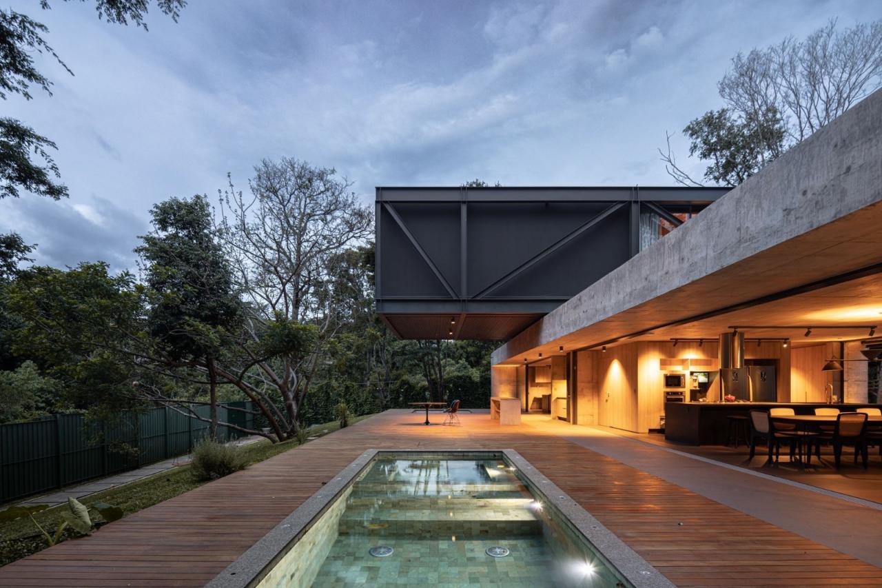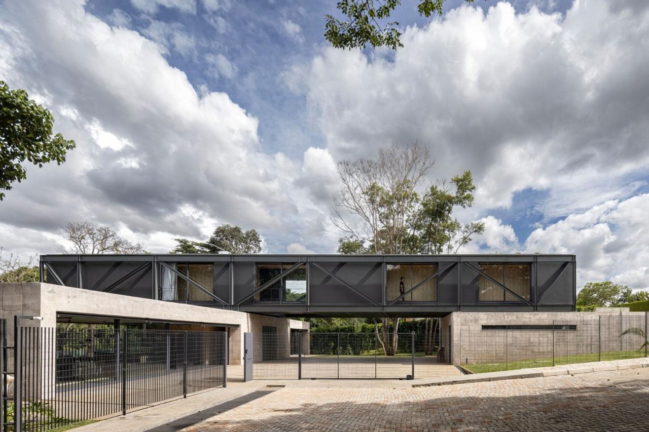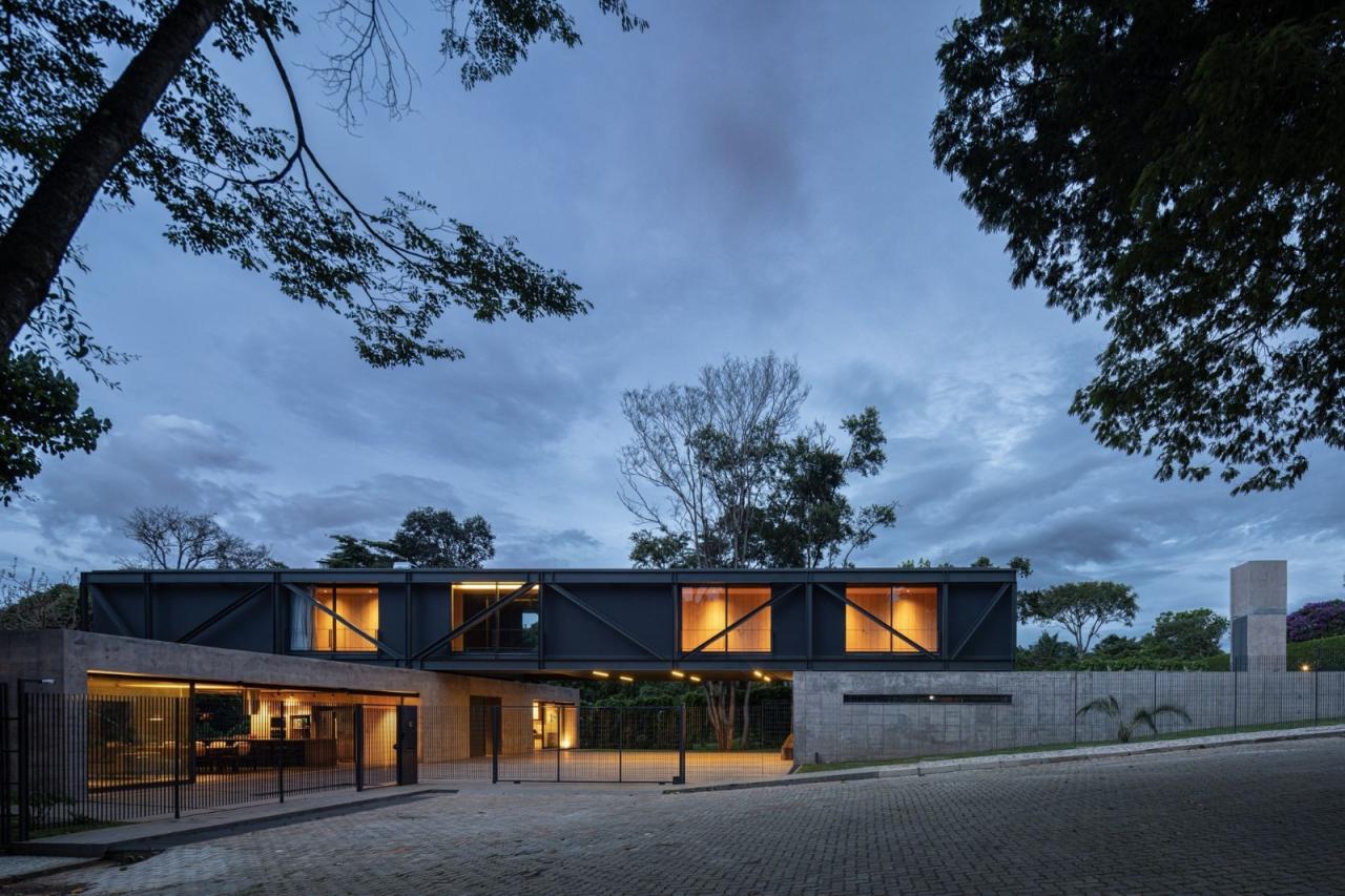 悬浮在坚实的混凝土平台基础之上,一个由钢元素构成的空中亭子巧妙地落在上面。悬臂朝向茂盛的自然景观,这个金属部件容纳了住宅项目的私密部分,以及所有的卧室。