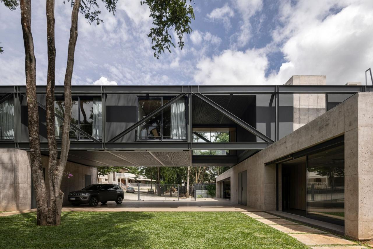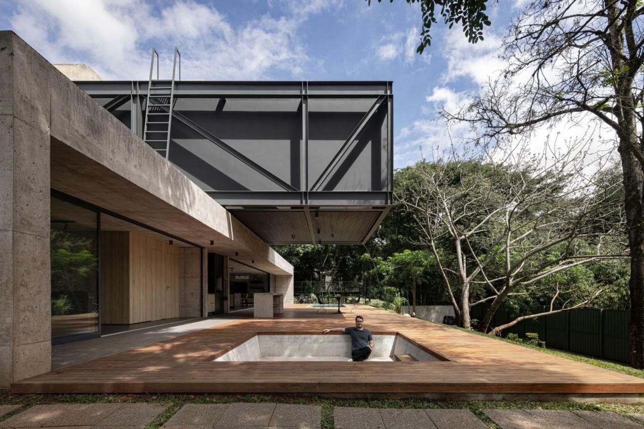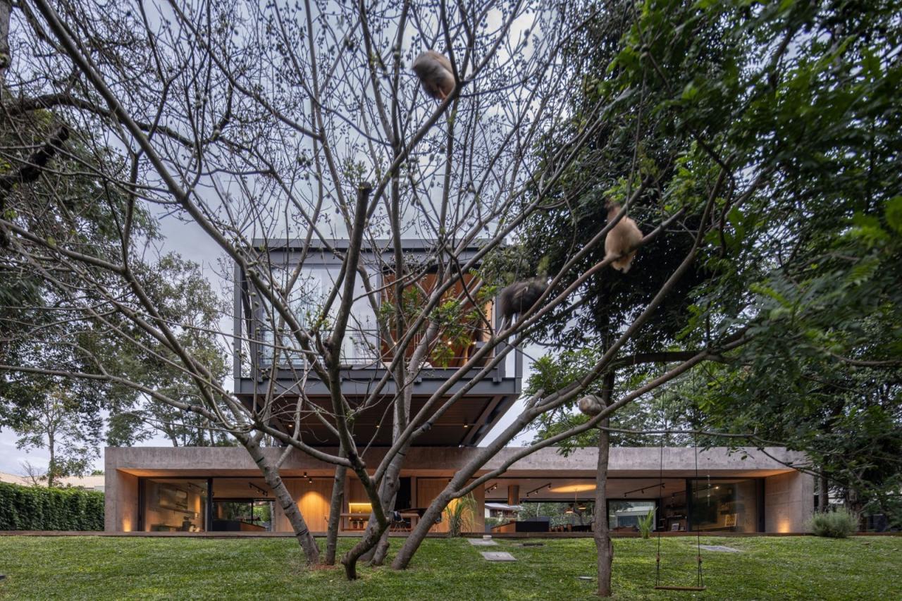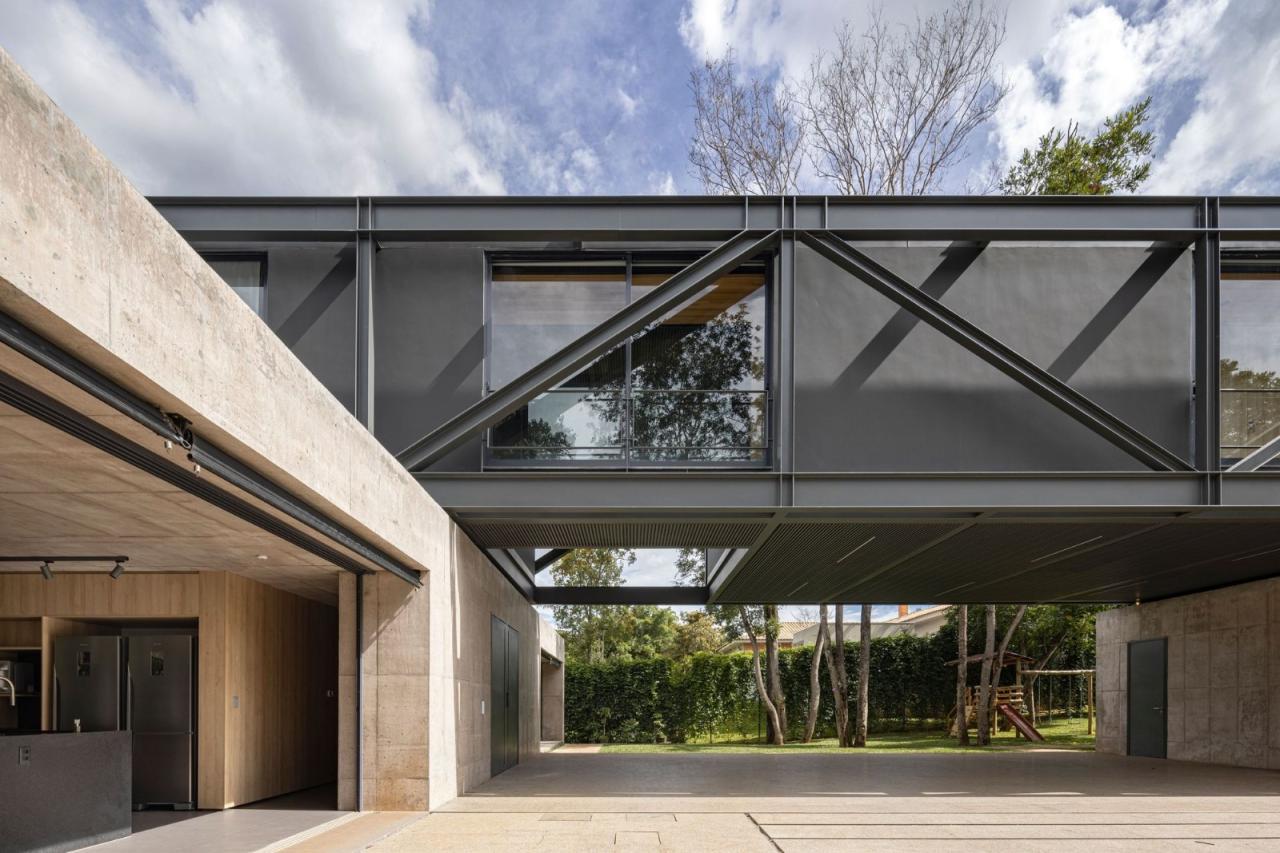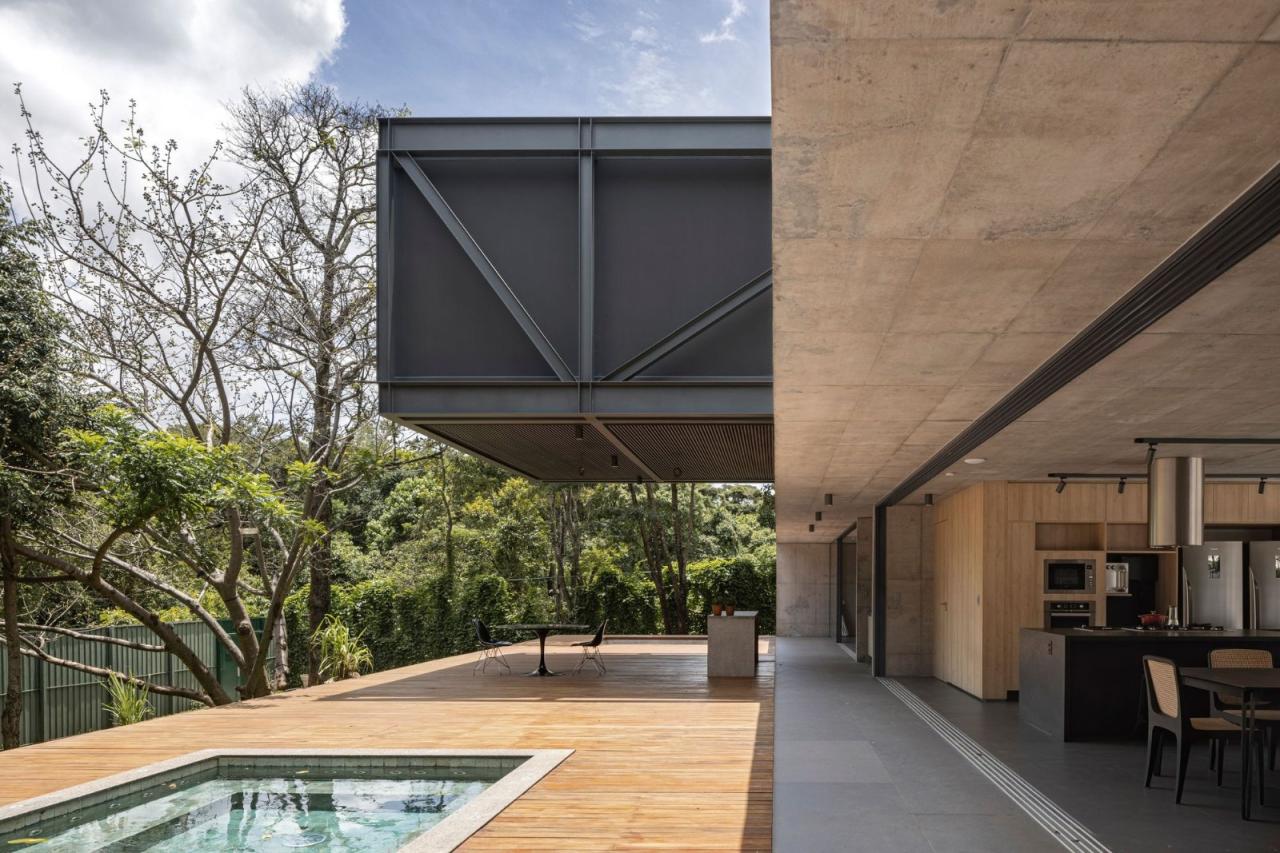 悬浮在坚实的混凝土平台基础之上,一个由钢元素构成的空中亭子巧妙地落在上面。悬臂朝向茂盛的自然景观,这个金属部件容纳了住宅项目的私密部分,以及所有的卧室。