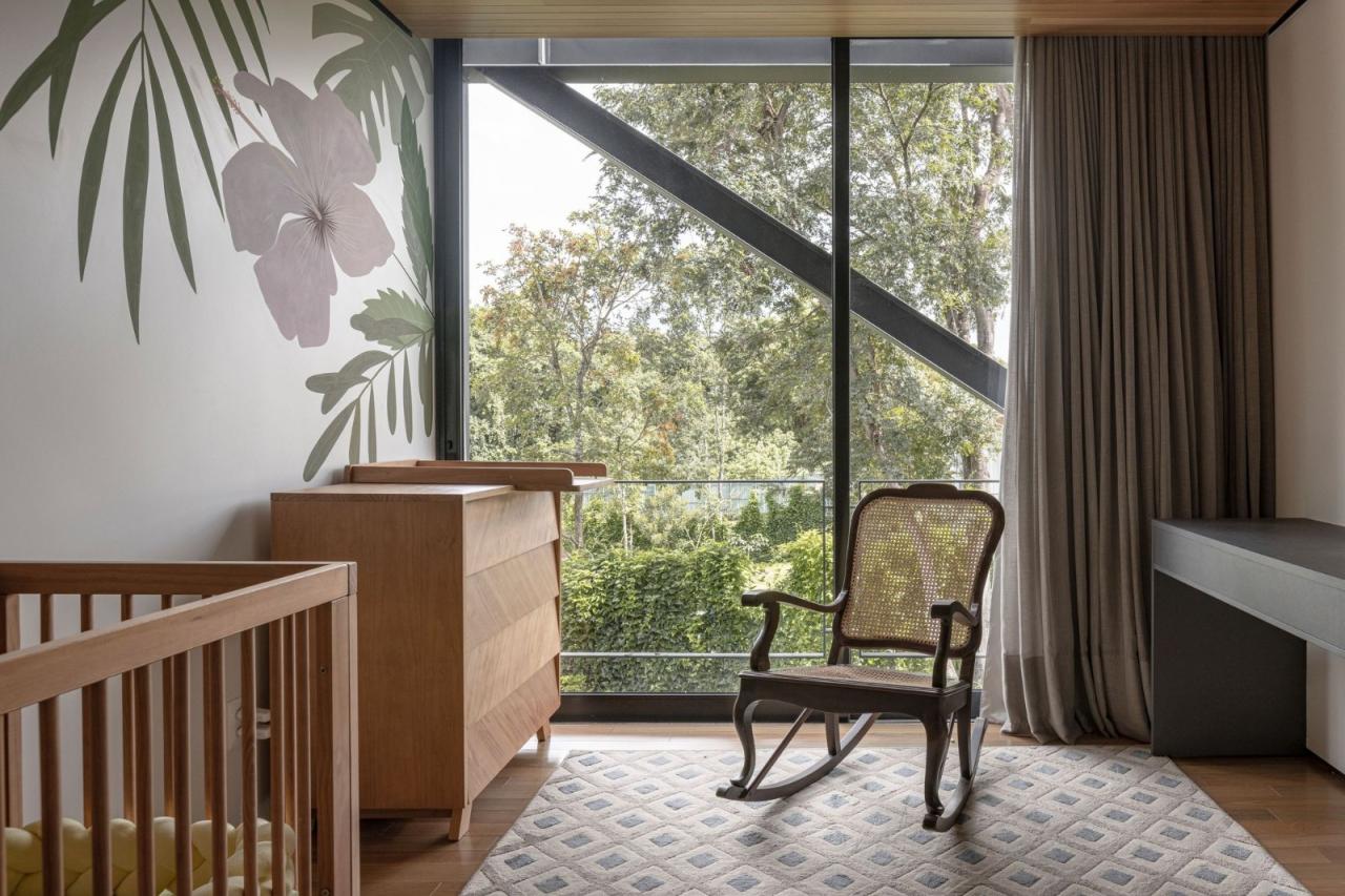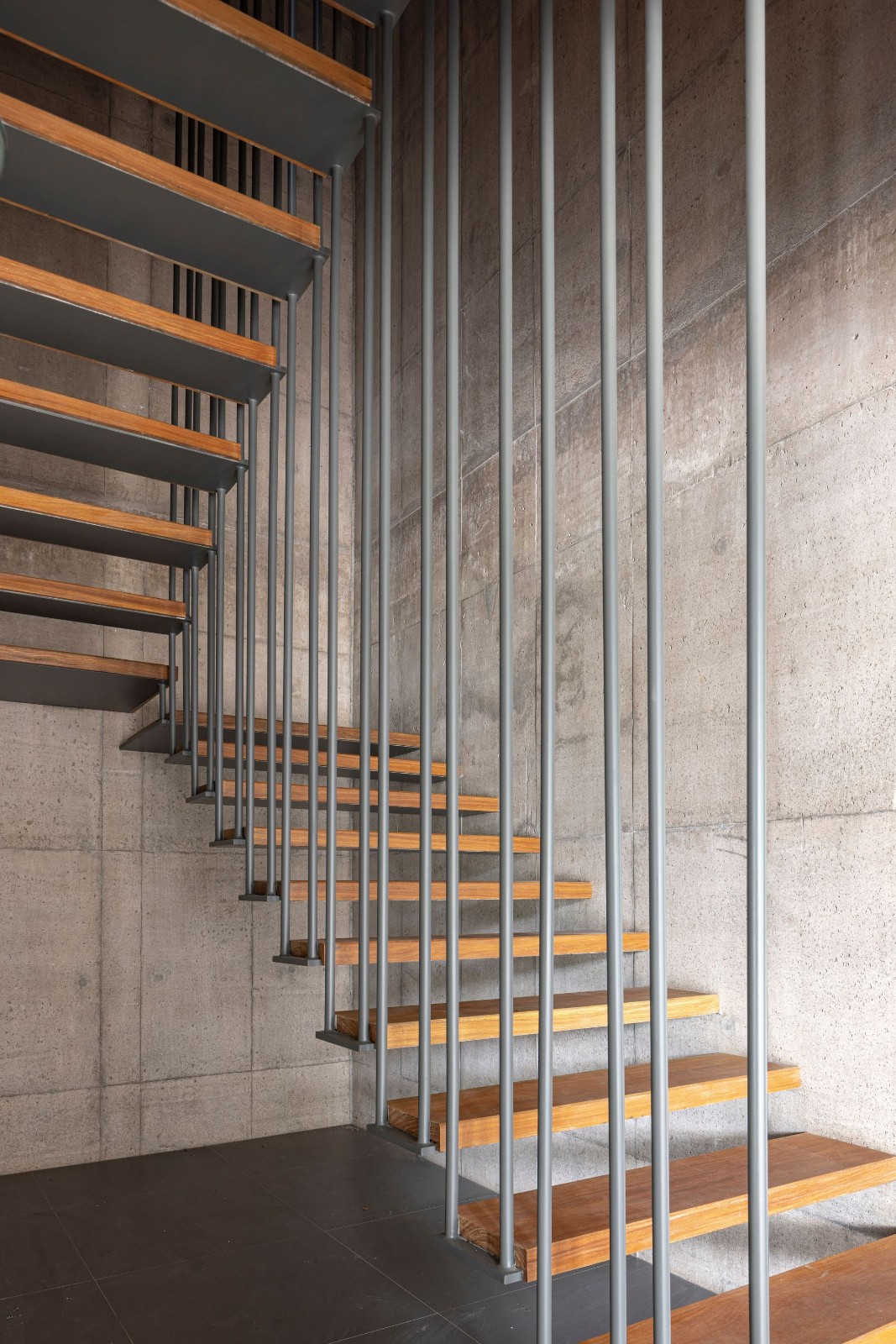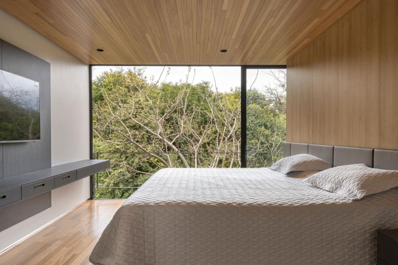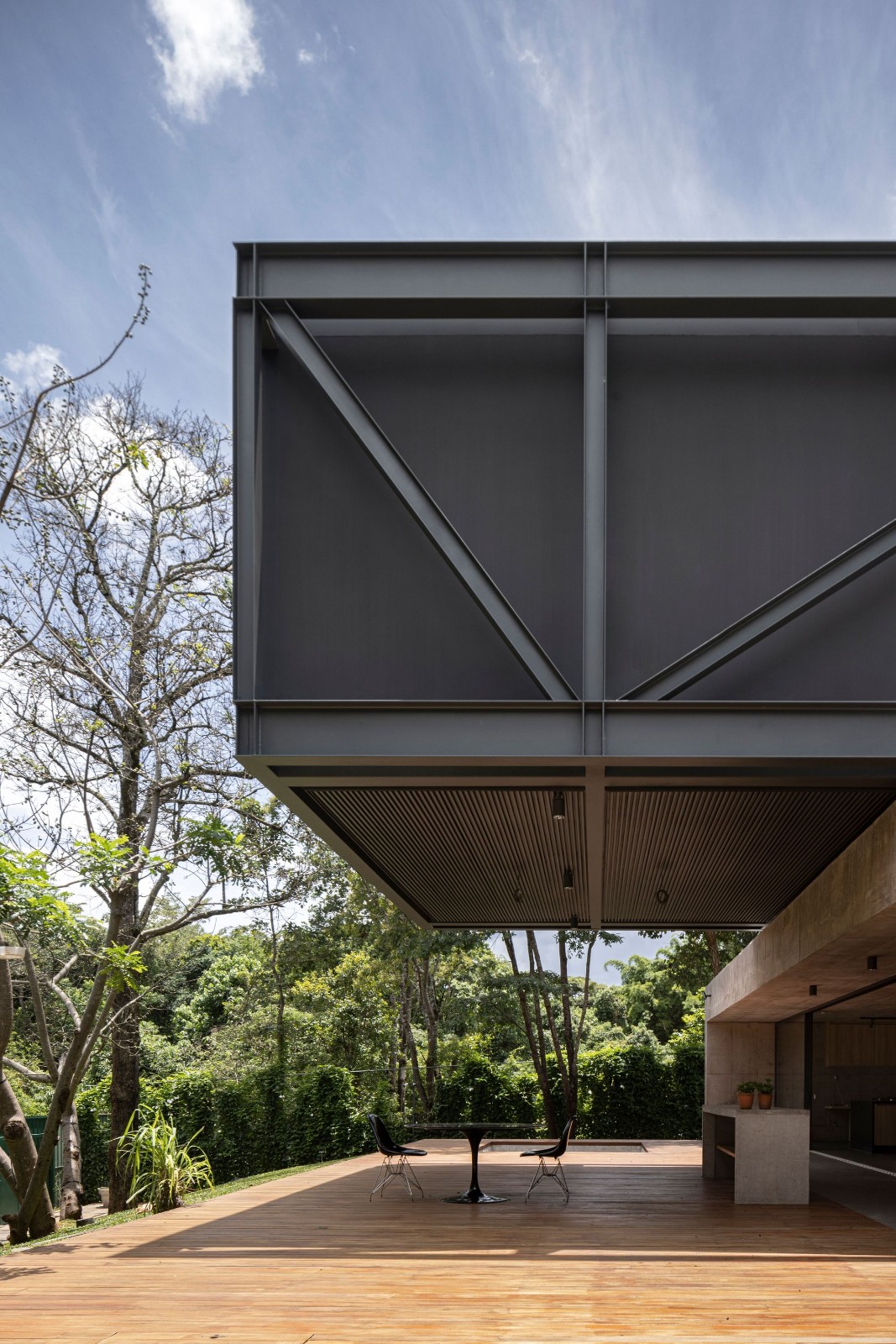 悬浮在坚实的混凝土平台基础之上,一个由钢元素构成的空中亭子巧妙地落在上面。悬臂朝向茂盛的自然景观,这个金属部件容纳了住宅项目的私密部分,以及所有的卧室。
