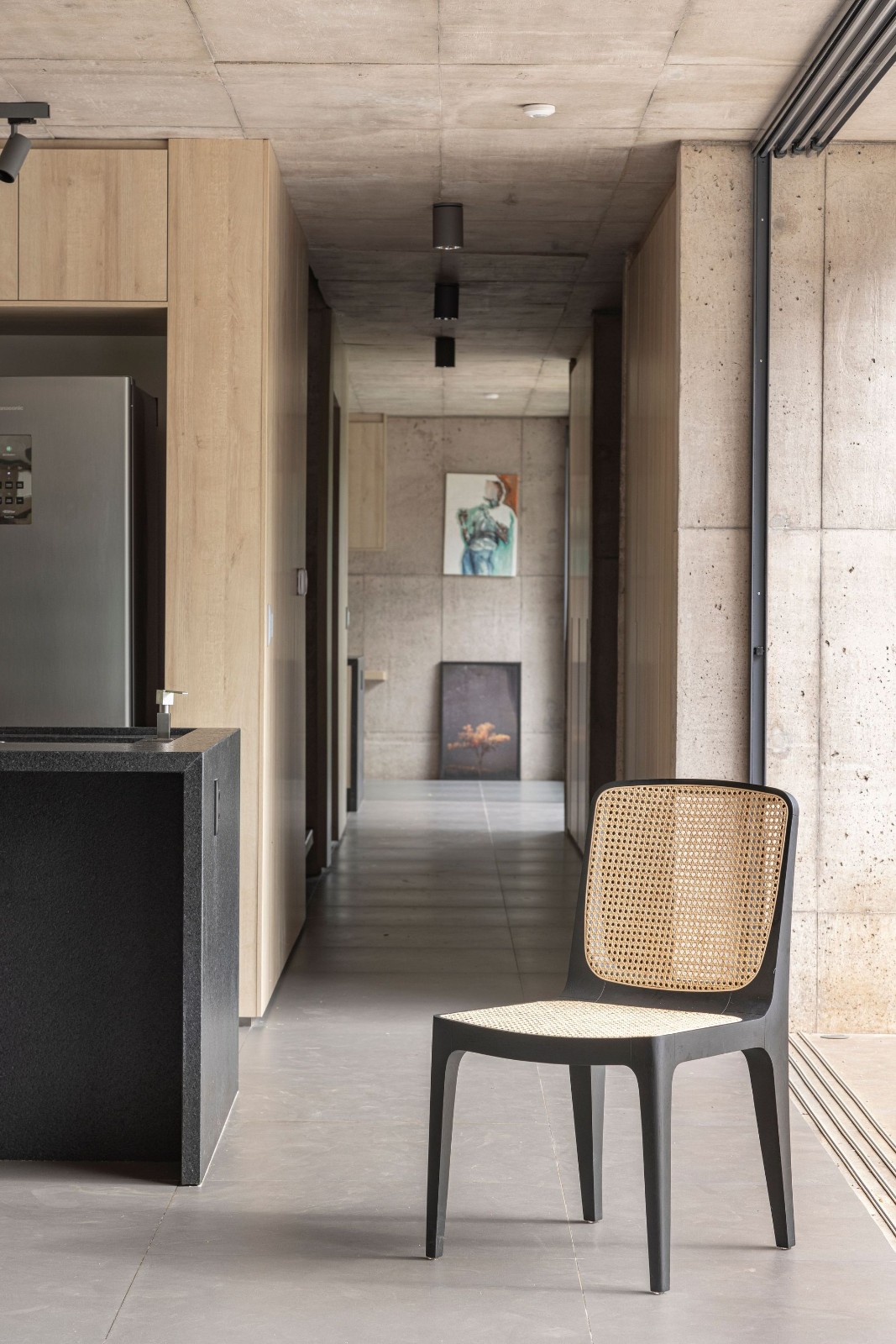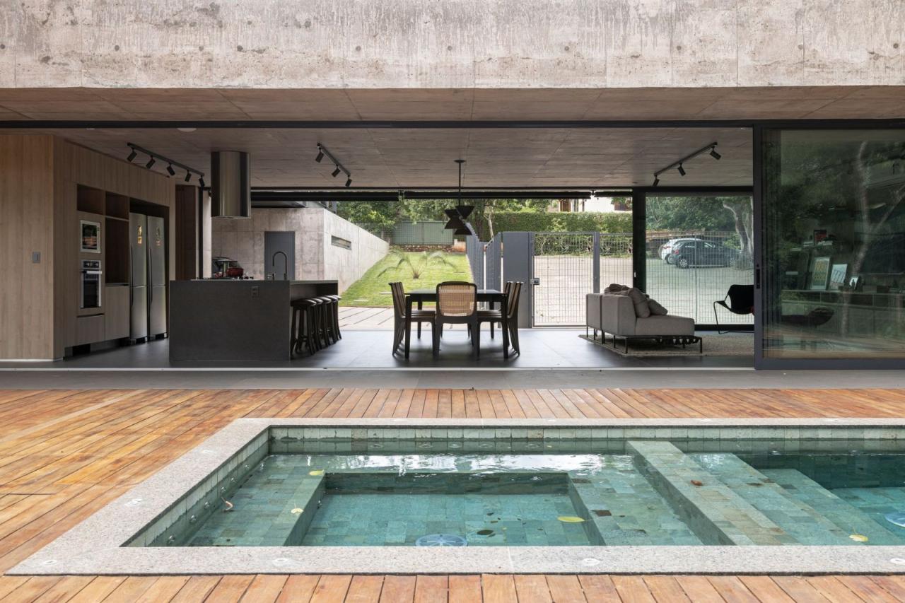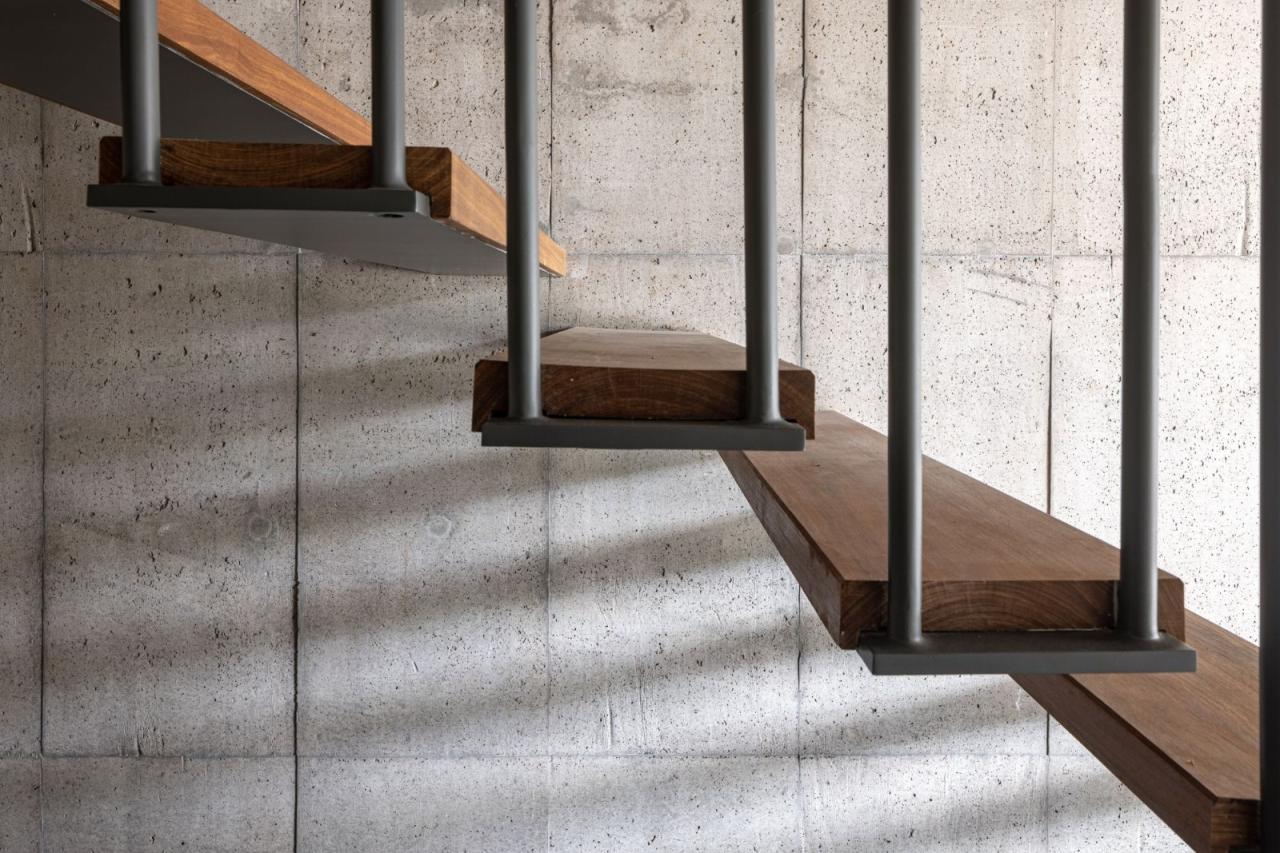 通过位于房屋核心的一个有意衔接的空隙,主入口被限制在厚重的立体底座中。作为一个混凝土基础,这个双拼的平台将自己与现有的地形结合在一起,使其能与周围景观进行微妙的对话,同时也不会让人忽视它的存在和材料的强度。