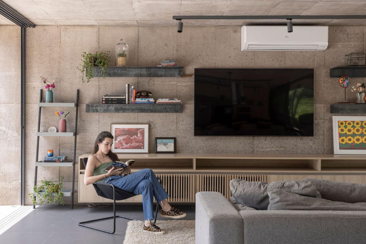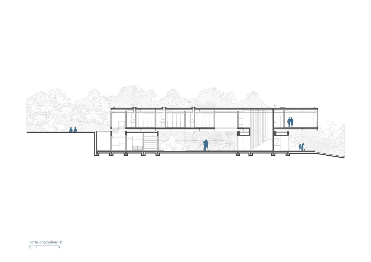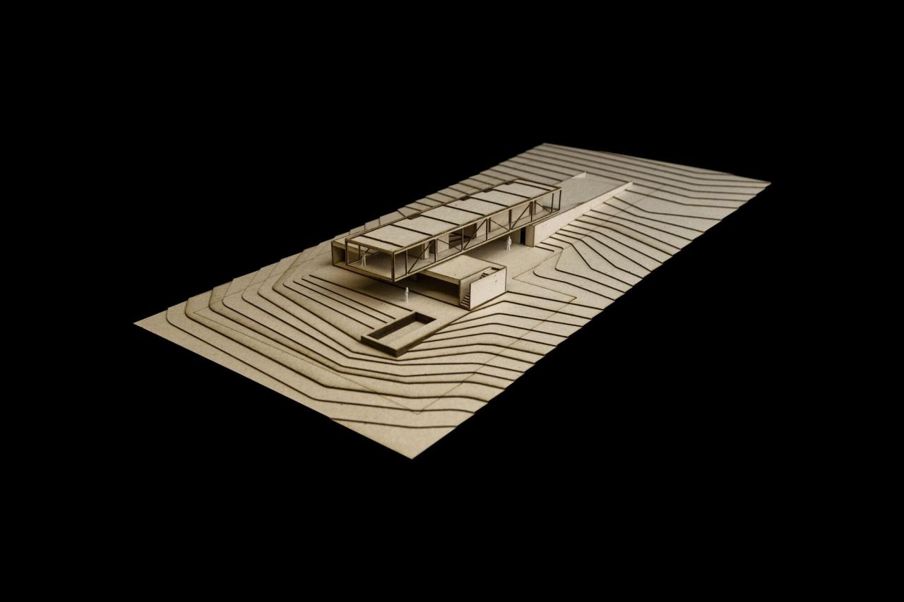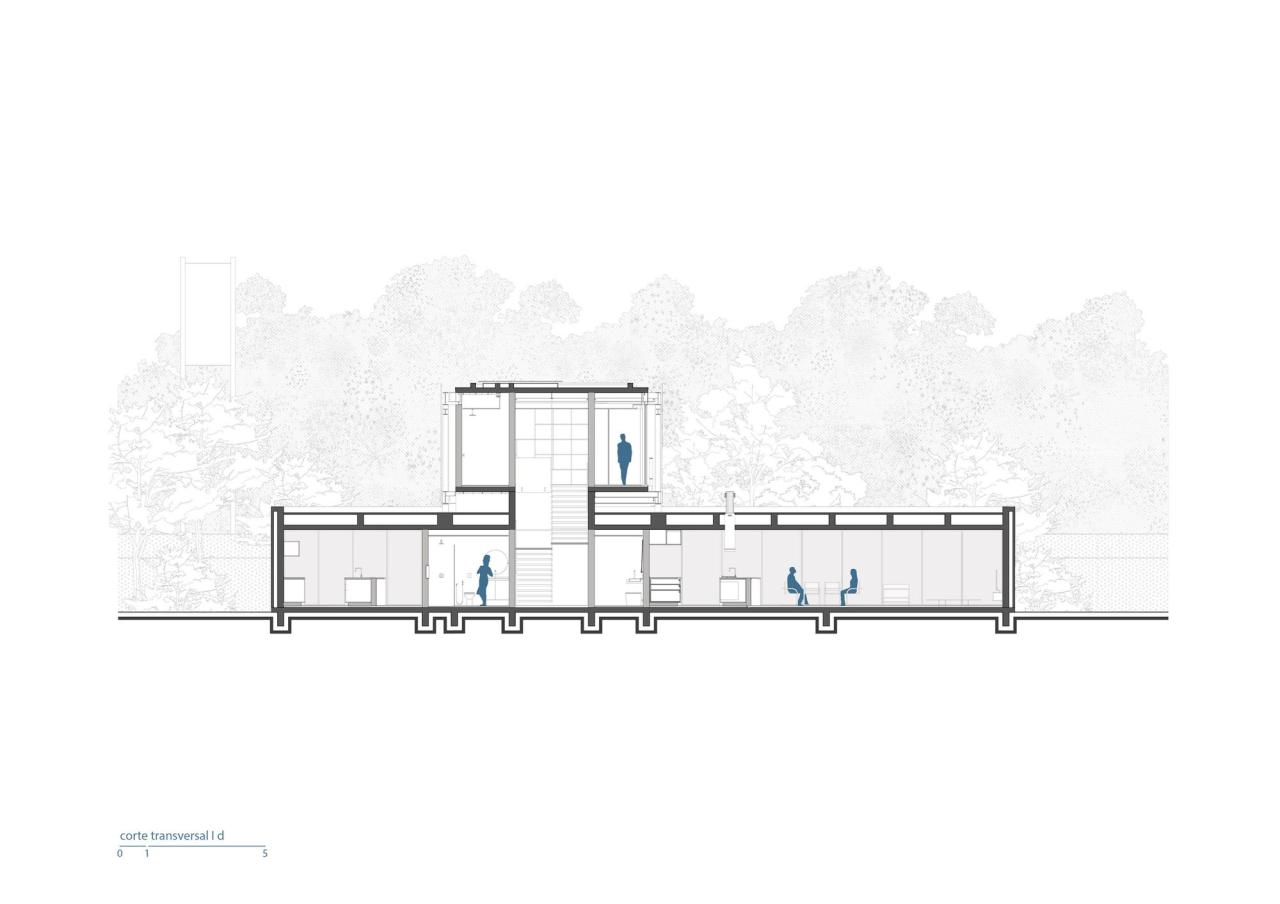 Habka 之家的基础平台由两个独立的、垂直的混凝土体量组成,其特征如下:第一个体块从下降的地理环境中升起,起初与最高的地形齐平,并向车库缓缓递增;其内部保留了服务空间。相比之下,第二个体量紧贴住宅的公共空间,向环境保护区敞开,用于支持住宅项目的休闲和社交空间。
