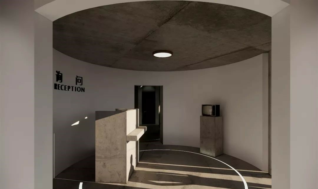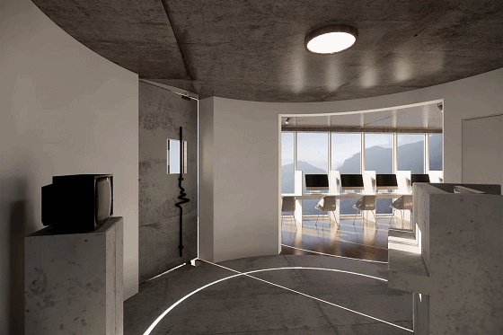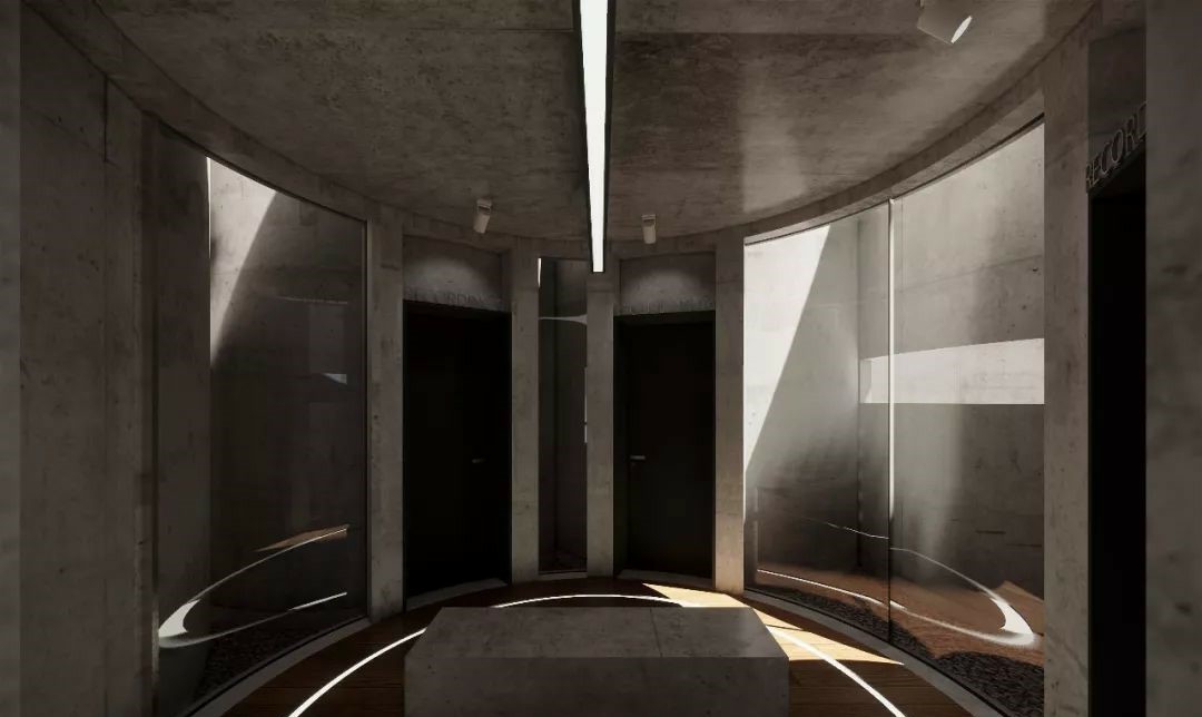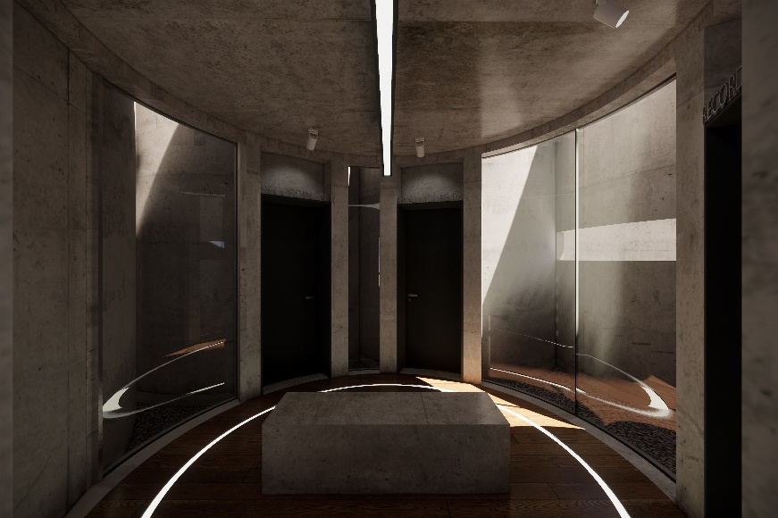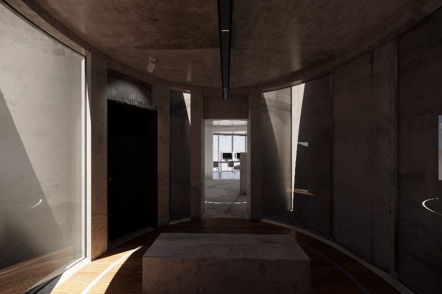 录音等候区是一处内外交织的空间。光线为这处空间照射出千变万化的图像。建筑圆形平面在此处被感知。