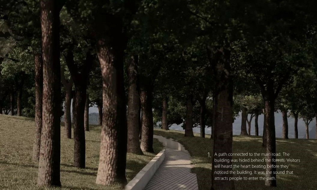 从主道路进入心跳博物馆的路径。建筑沉入山体,被树林遮挡。游览者会首先听到从树林深处发出的心跳声,并沿着声音发出的方向走进心跳博物馆的场地。这是一次感官被不断放大的仪式过程。建筑师希望给参观者呈现的首先是艺术家作品的一个侧面,而不是建筑的外观。希望这个过程既是塑造仪式的过程,也是抛弃形态给与参观者先入为主的视觉形象的过程。