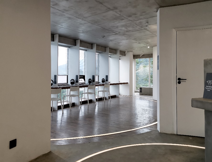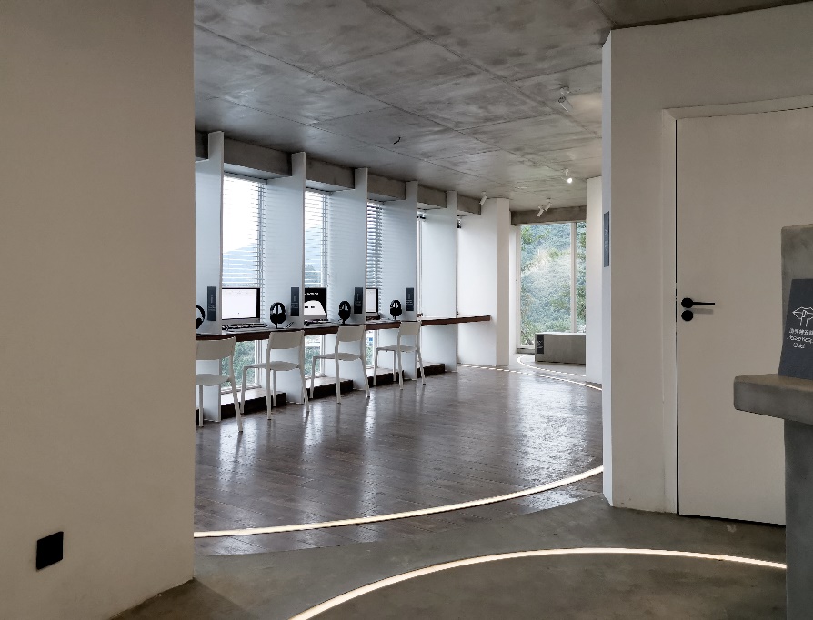 进入建筑,来到心跳博物馆的接待室。接待台和文献台同样用混凝土制作而成。接待室一侧的小门通往录音等候区。