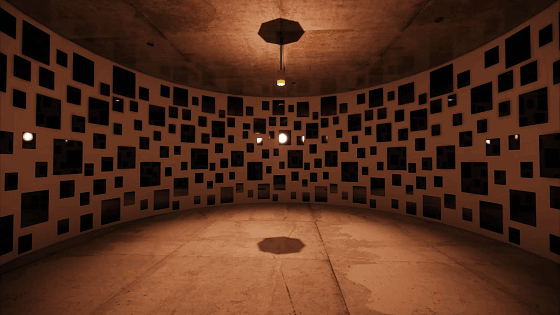 心室是一个整体的装置,墙面四周采用黑色镜面亚克力内嵌入墙体面层,所有的亚克力板面均对准心室中闪烁的白炽灯,参观者在心室中心将随着心跳的频率看到无数个自己;伴随着被放大十数倍的心跳的声浪,身体和整个空间一起振荡,这也许将是一次充满力量与思考的体验。