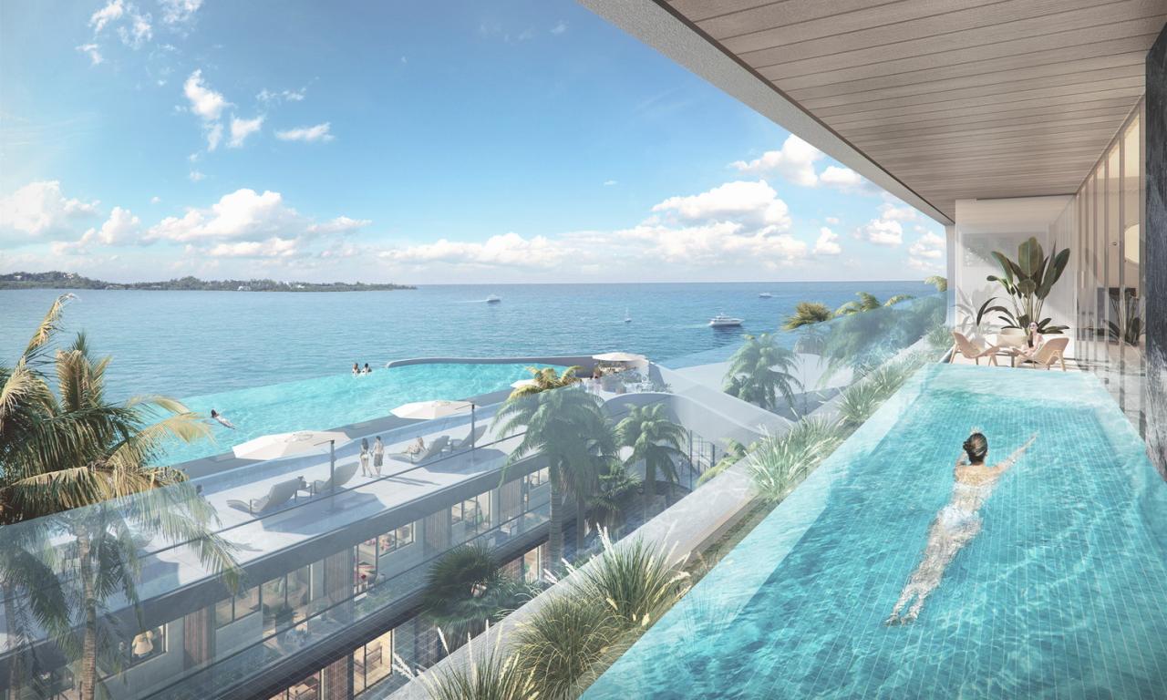 前楼的屋顶也被用作公区的延伸,布置了无边泳池、露天酒吧等休憩空间,同样方便通往后楼的二层。从后楼高区的阳台泡池,到屋顶的无边泳池,再加上远处的海水,层层海景营造水天一色的体验。
