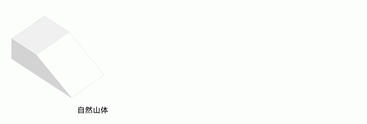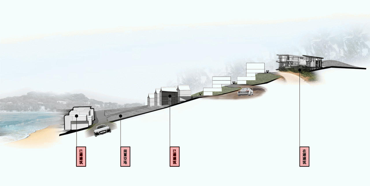 10栋别墅分布于上中下三个台地,一个“S”形为一个别墅单元,把地面、楼板、屋面形成一个完整单元,上台地两组并排,中台地两组,下台地两个独栋,结合山形上下错动,各自分南北入户,保证了私密性的同时又具有最开阔的海景资源。