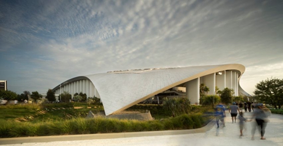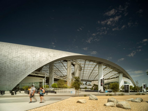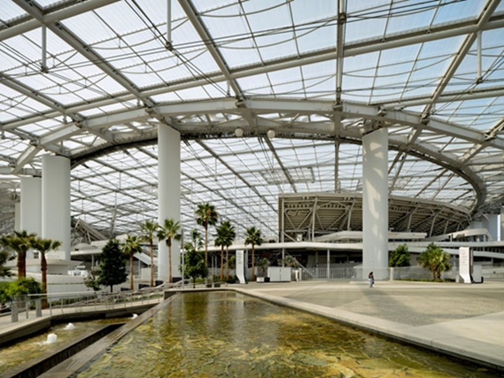 这个体育场,连同邻近的6000个座位的音乐场馆和连接广场,都被一个巨大的屋顶覆盖着,屋顶的形状像“海上波浪”。兰斯-埃文斯说:“这不仅仅是一个体育场,事实上,拥有6000个座位的YouTube剧院和占地2.5英亩的美国航空公司广场也位于一个巨大的俯冲屋顶下,也保护着职业橄榄球大联盟(NFL)的最大的体育场。”