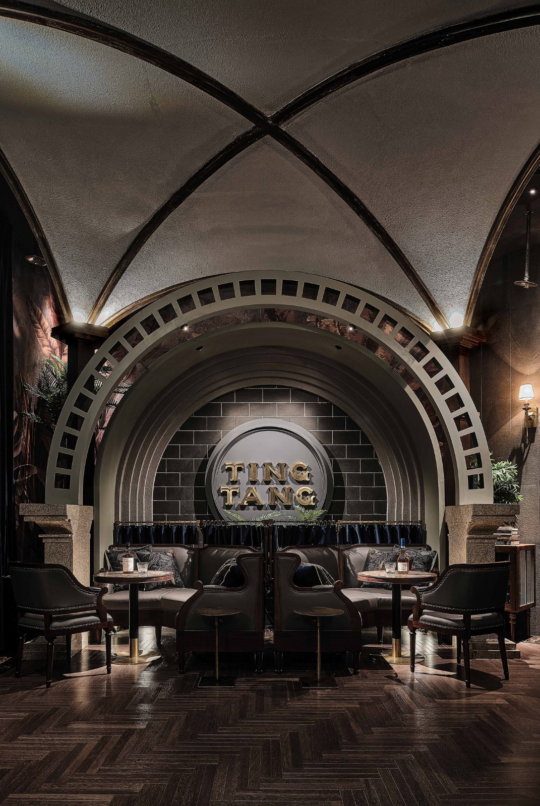 设计团队以营造精致空间质感为起点,从维多利亚时期的建筑风格中汲取灵感,在布局方正的空间中遵循十字轴线形式中的秩序性与建筑感,强调空间层次的连贯与局部装饰的点缀。在层高优势不突出的情况下打造拱形顶架,运用结构之美增强空间的独特风格。观赏与穿梭间,客人在理性和感性边缘游走,仿佛在厅堂之中微醺,重温几世纪前的一场时代琳琅。