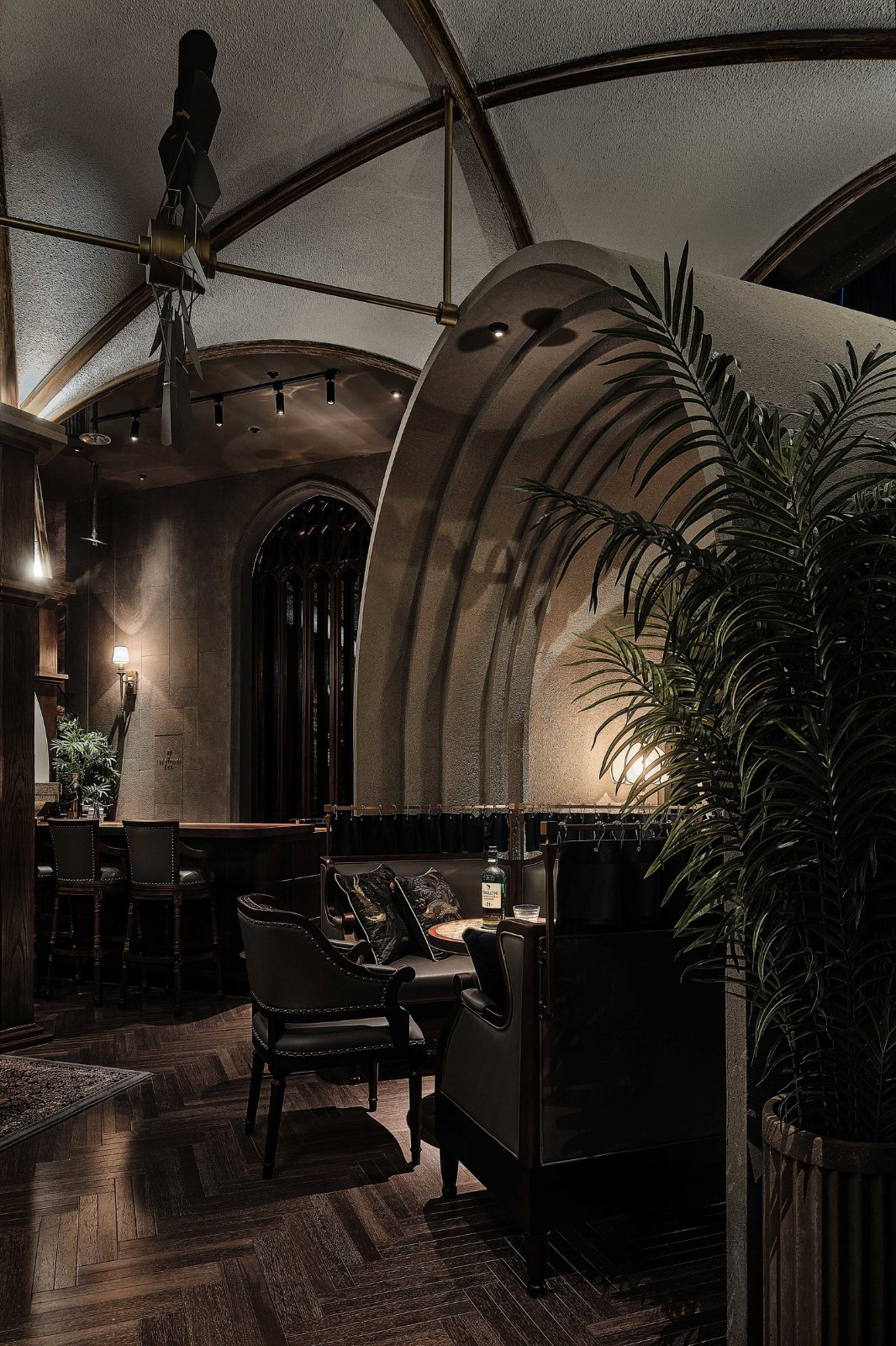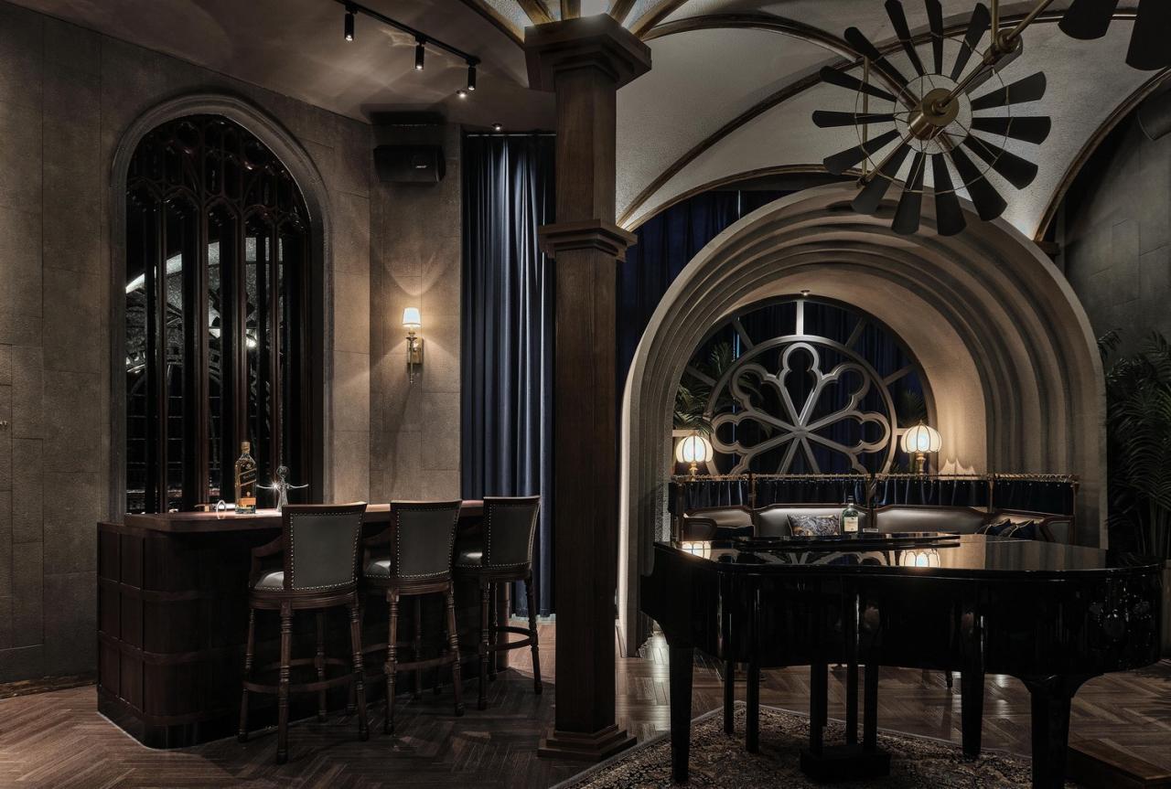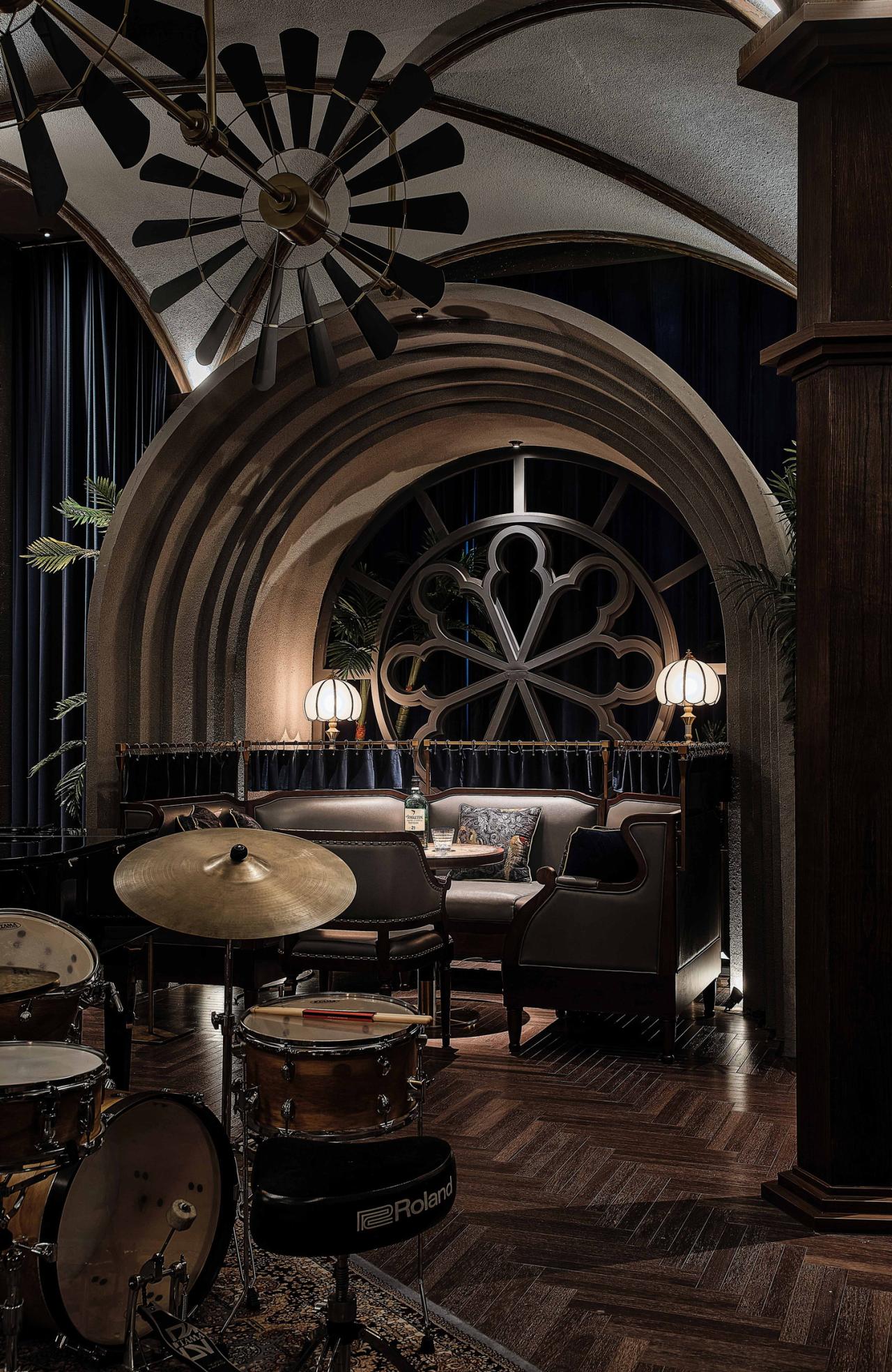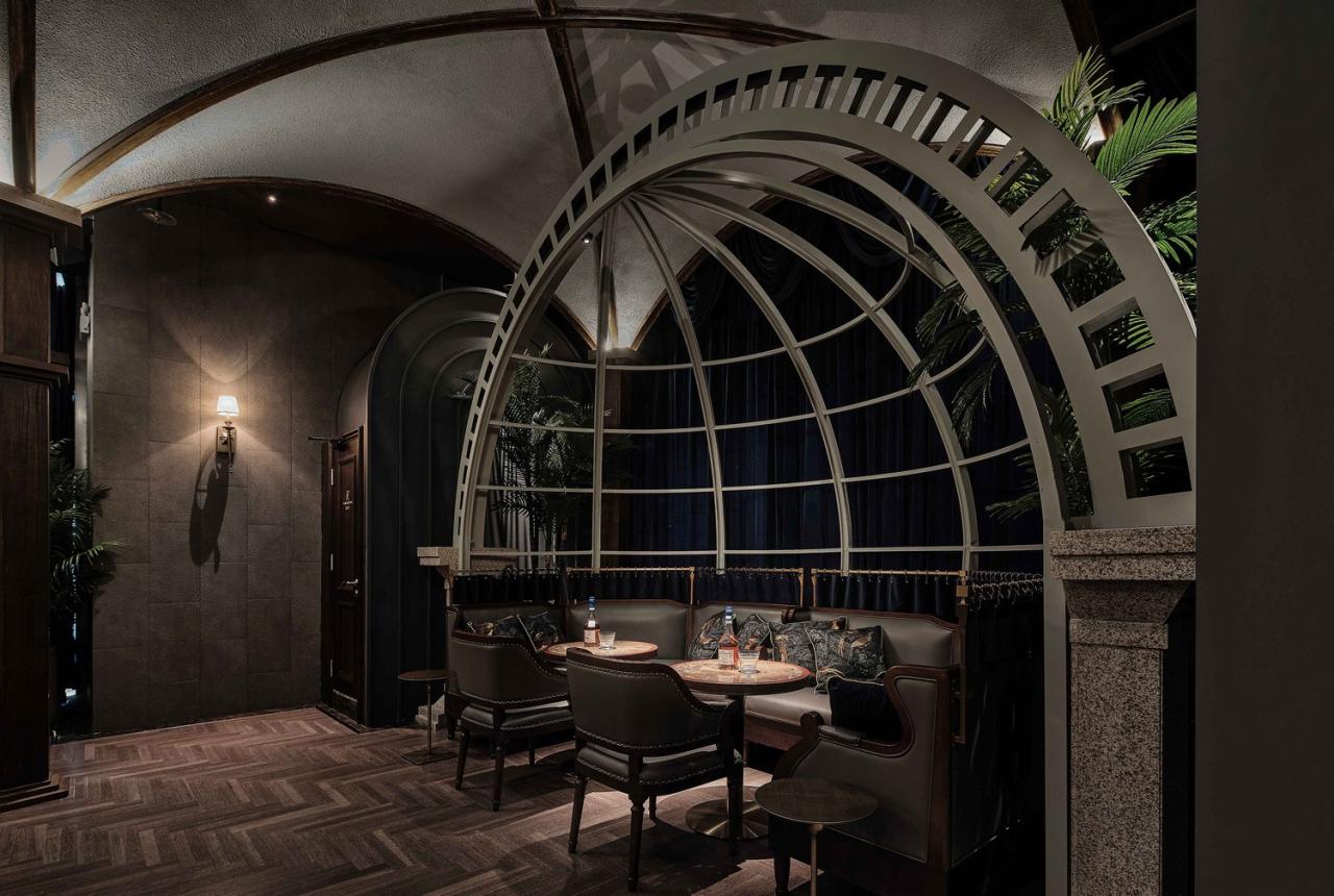 几何弧形、拱顶与花格窗,颠倒内外的趣味空间关系让构筑中的自由精神轻盈流动,人们沉浸在氛围幽深的连贯空间中,被探寻的厅堂秘境引领着志趣相投的酒客们与维多利亚时代的飘逸对望。