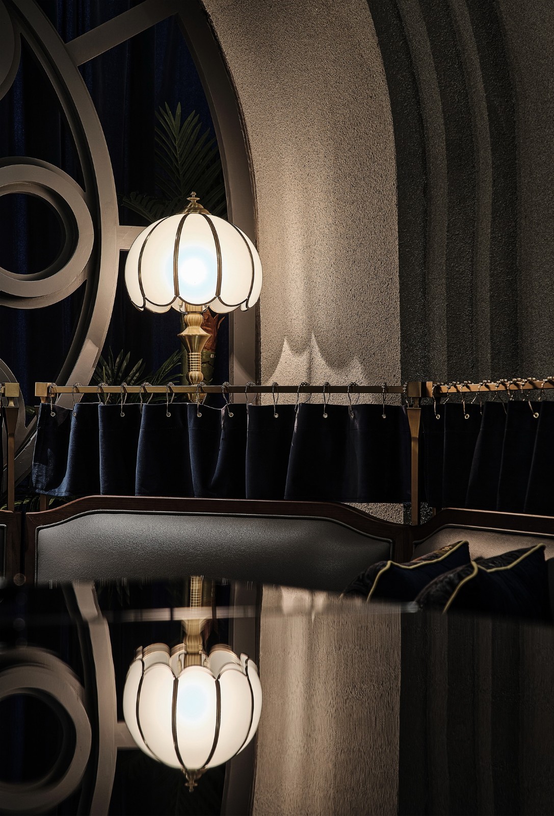 空间整体的材质基于复古的风格调性,金属、皮革与木质的多元混搭在空间框架中呈现出独特而精致的质感。局部暖色采光激发出古典家具的华丽气息,在拱顶结构间为空间注入文艺复辟之灵。