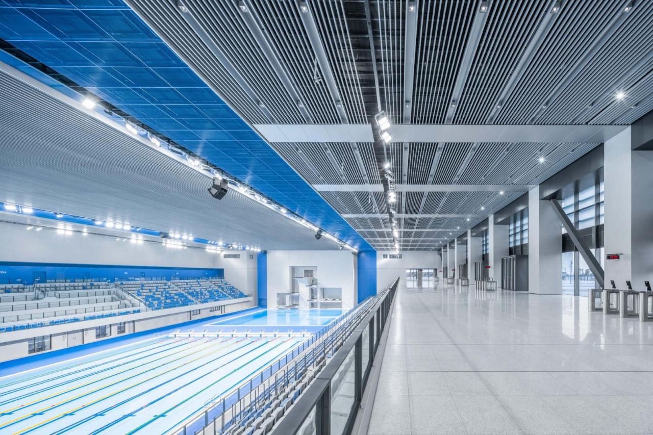 这三座体育馆在平面上呈正方形,由一个共同的基座相连。篮球、乒乓球和羽毛球等室内训练设施以及餐厅、商店和停车场面向开放式广场布置。由银色铝制元素构成的百叶幕墙使建筑群从远处看极为耀眼。银色铝百叶朝幕墙中心方向逐渐翻转打开,展现出内部不同功能空间的形态及颜色。每座建筑都有自己的颜色代码,便于访客在场地及体育馆内辨认方位。