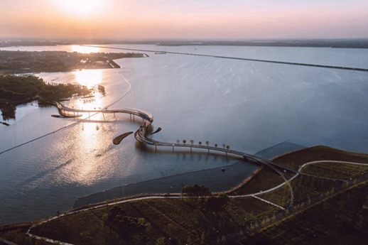 在这一项目中,一座蜿蜒的大桥将上海元荡湖(Yuandang Lake)的两个湿地连接起来,该桥融合了玩耍、休息和种植的空间。该项目由“布雷利建筑-城市学家工作室”(Brearley Architects + Urbanists.,缩写为BAU)设计。