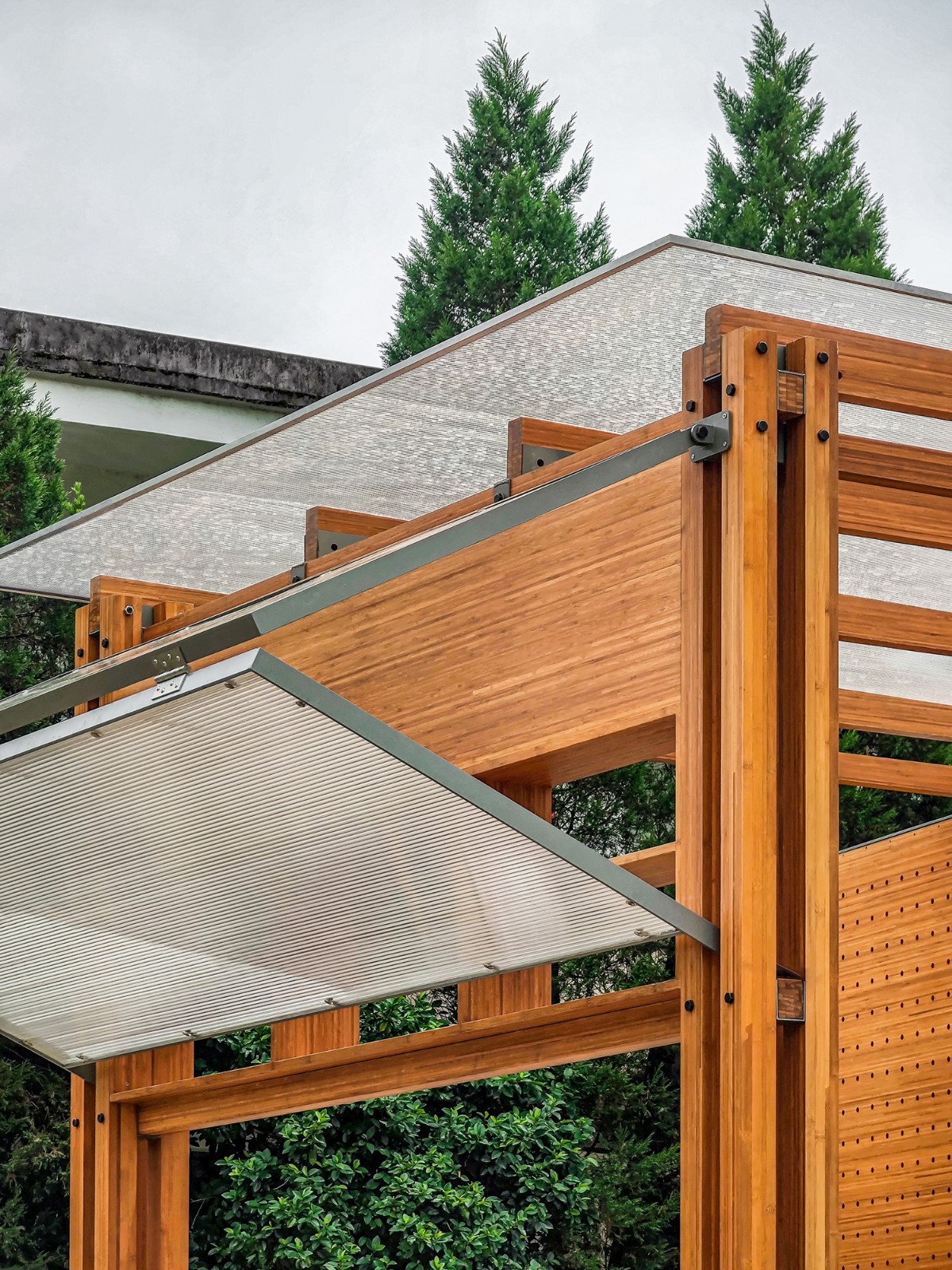 工作舱的主体采用耐候性与生态性兼具的工业化竹集成材,以“主框架+墙面”的逻辑构成。主框架的竹材杆件(柱、梁、龙骨)均在工厂预制完成并预留孔位,在现场用对应的钢构件和螺栓进行安装固定,整个搭建是十分低技的,仅需扳手和自己的双手,未经建筑学专业训练的村民和孩童也可以参与到建造的过程中来。