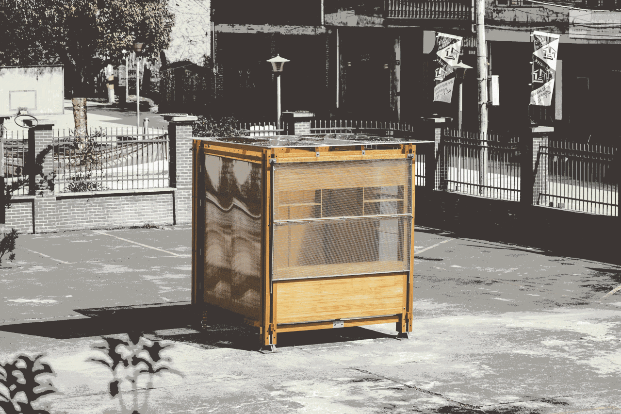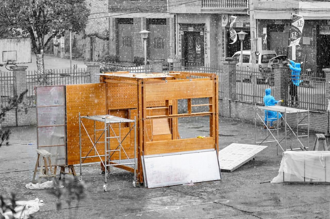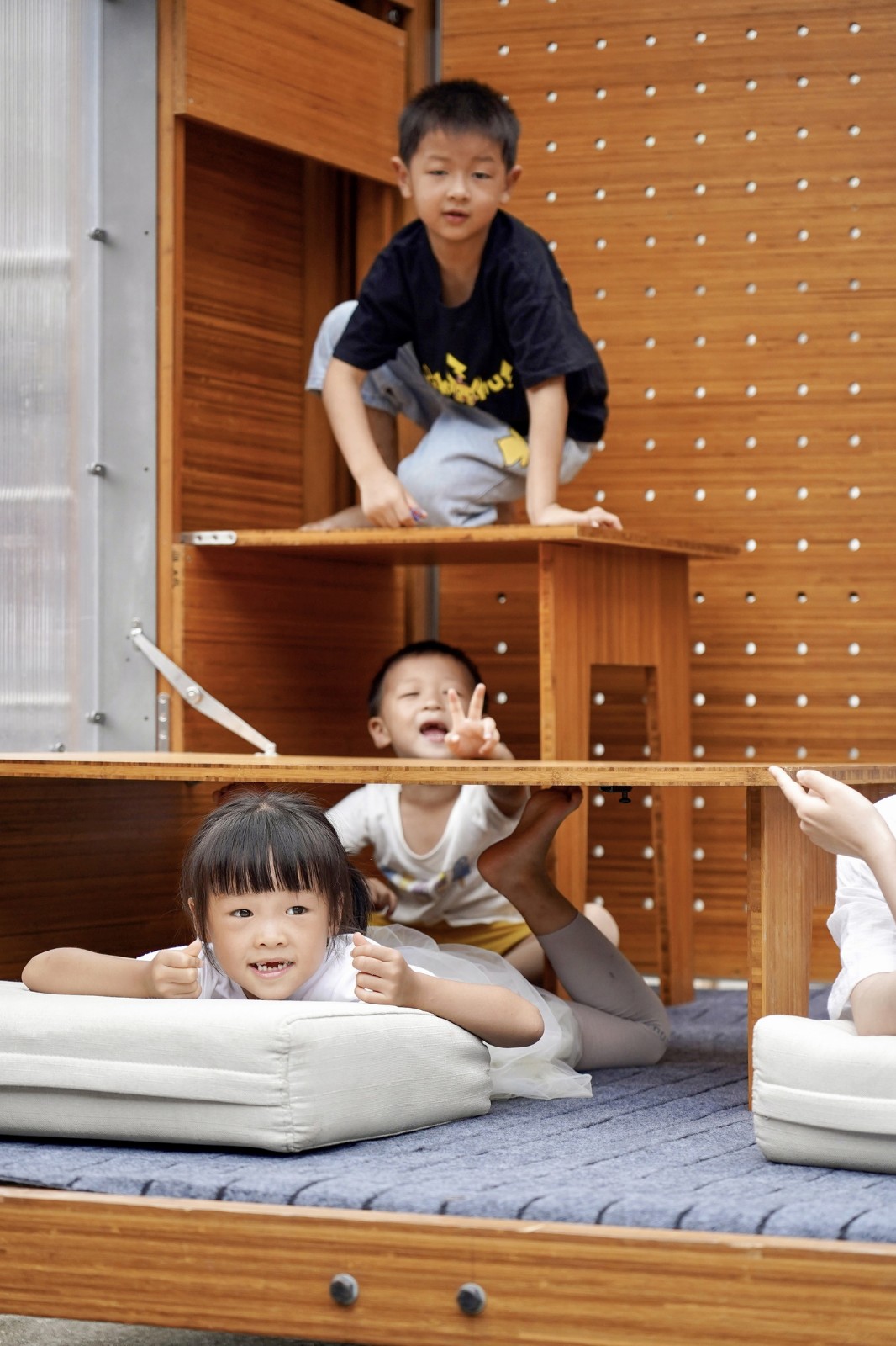 本次的工作舱建于松溪县项溪村一所废弃小学内,供村民休憩、孩童玩耍之余,还需作为艺术文化的传播窗口,承办松溪版画相关的庙会活动,涉及到展陈、售卖、工作、观影等多种功能,因此最终产品由一面“售卖墙”、一面“体验墙”和两面“展示墙”构成。这是建成的第一座工作舱,此次它的主要任务是在松溪县项溪村的一座废弃小学内扮演一个承载版画艺术与文创活动的容器,下次、下下次,它可能出现在其它村子里,激起不一样的浪花。