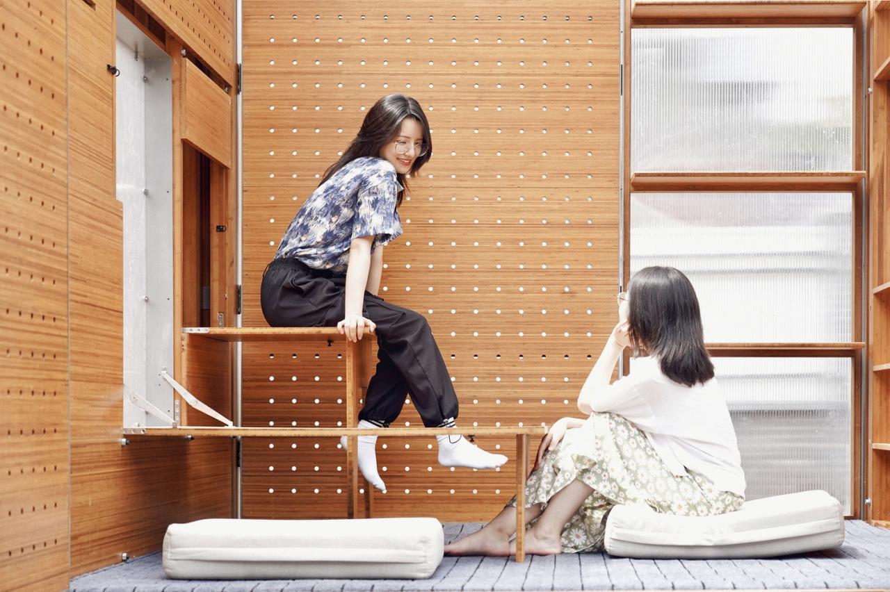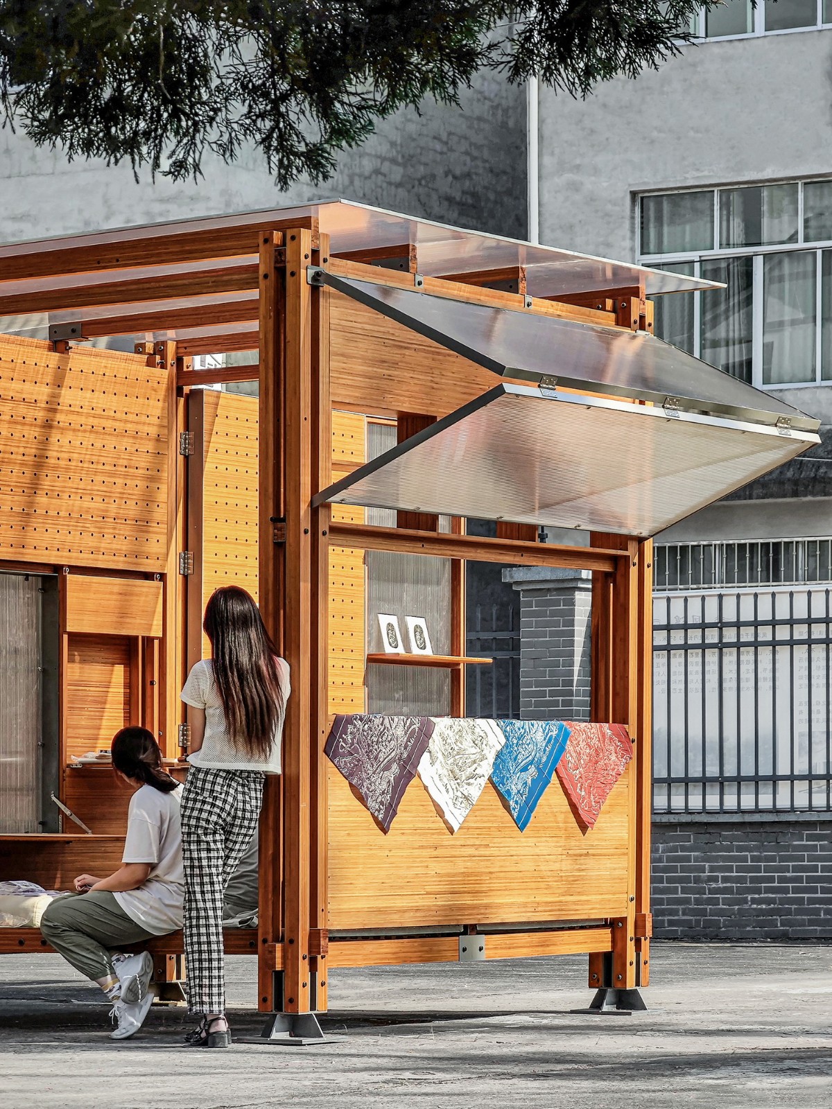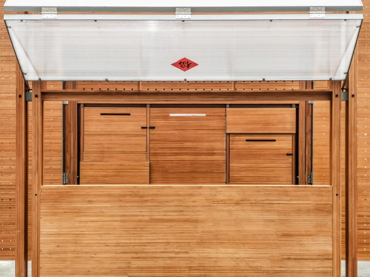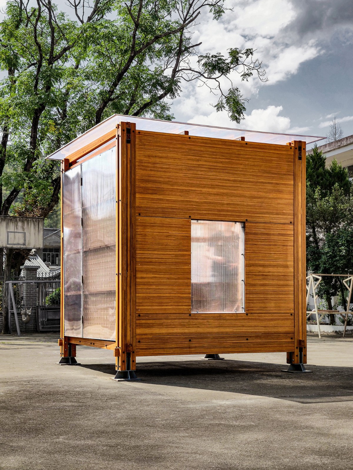 作为一种能够应对乡村中空间环境、使用人群、功能需求等多重不确定性的空间产品,工作舱的定制与生产遵循面向用户原则,在主框架结构不变的基础上,为使用者提供不同种类的功能墙选项,墙面的主要材料是阳光板和竹板材,且每面墙根据其功能设定具备不同的可活动程度(固定、半开启、完全展开),包括门窗、展台、储物柜和折叠式家具,可以根据实际需求自行组合,获得最终成品。