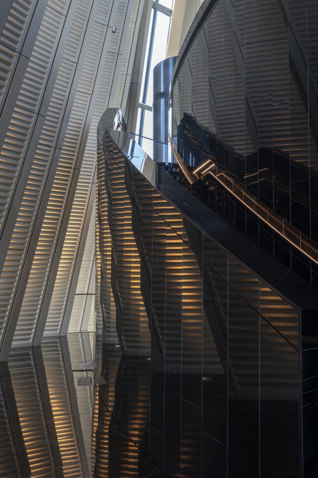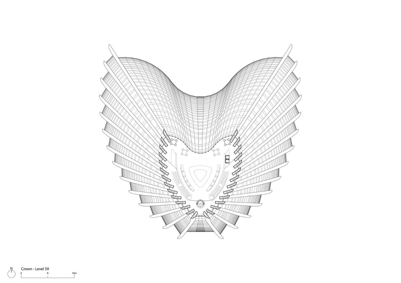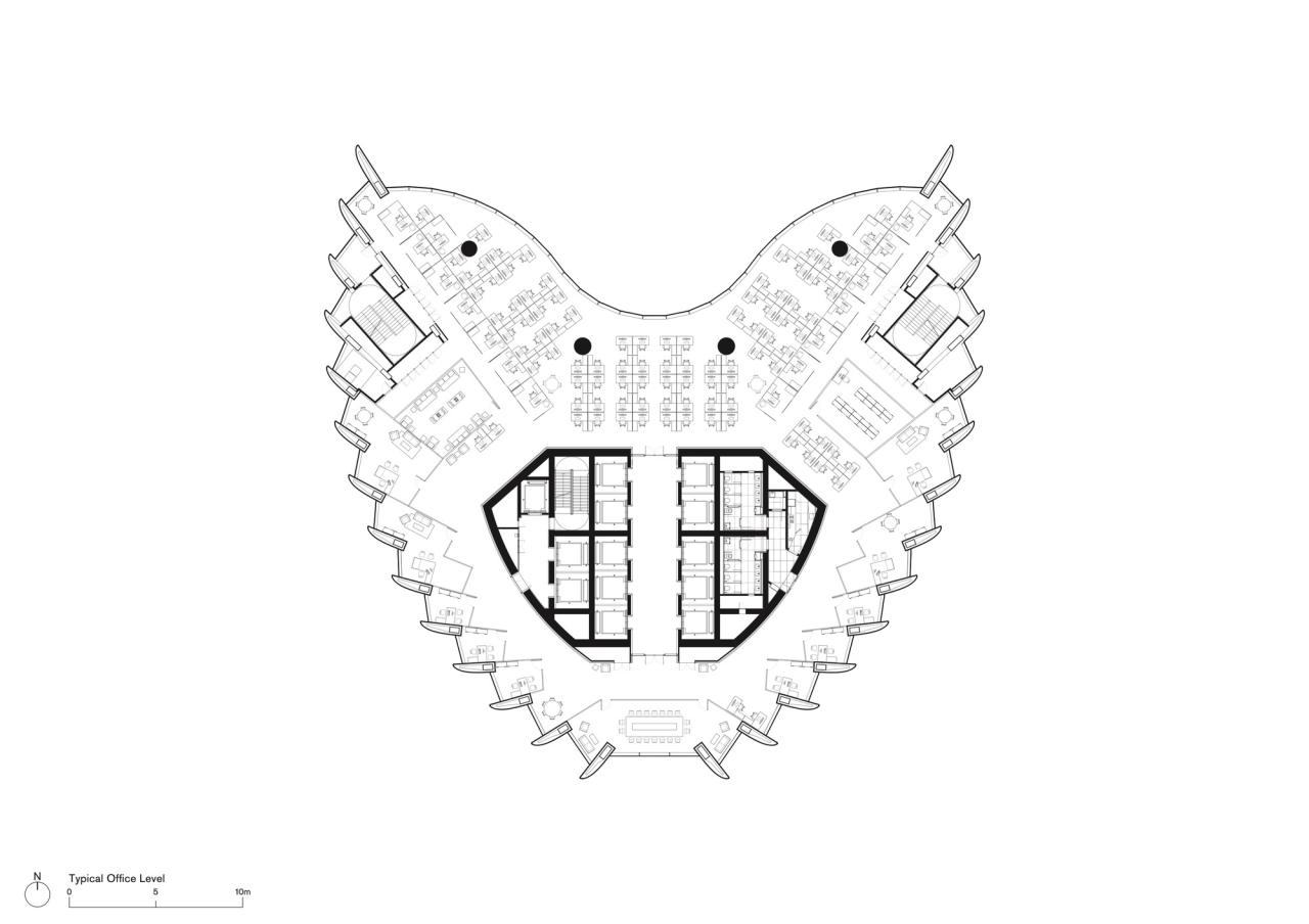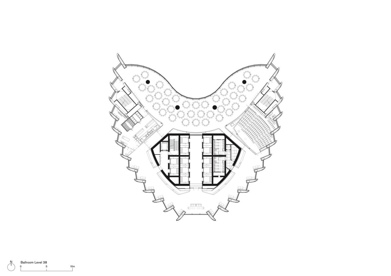塔楼的独特轮廓使得建筑顶部能够设置宽广的顶层平台,为使用者提供了俯瞰周围全景的机会。大楼的 63 个楼层均设有空中大堂,为员工提供了聚会空间和会议设施。塔楼底层的 18 米高厅是迎接员工和访客进入的首个空间。建筑师还在 18 楼设置了双层餐厅,在 19 楼配置了最先进的健身房,并在 38 层设计了独特的宴会厅和礼堂,以欣赏海湾和城市全景。这些公共区域与位于塔顶的主席俱乐部相辅相成,主席俱乐部拥有独特的弧形天窗,在空间内划出一道弧线。