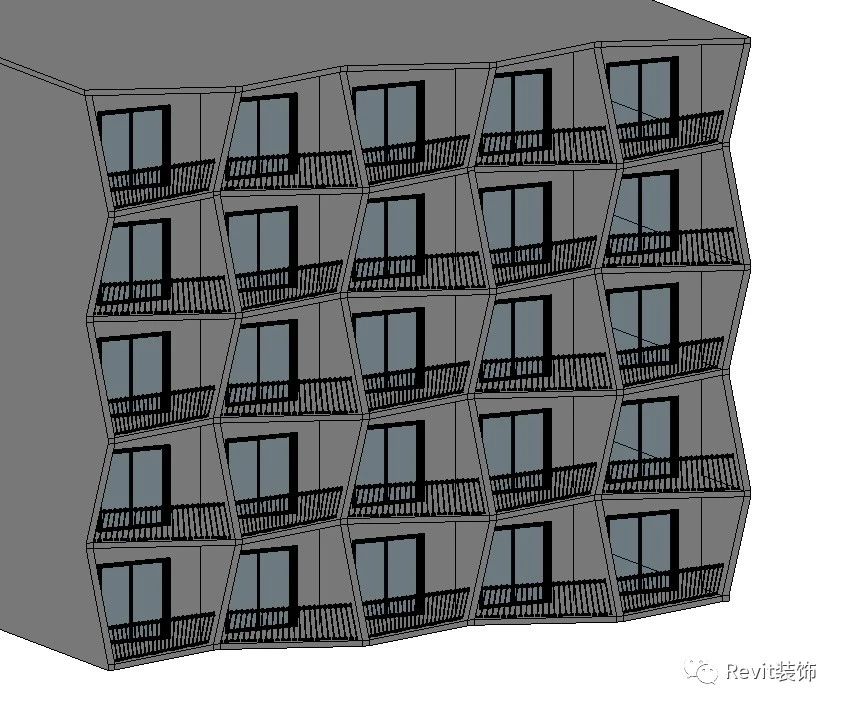首先我们应该先建出来这个建筑的外立面,我想这并不难。只需要通过墙体的轮廓编辑就可以了,绘制好一对墙体,进行复制就可以了(。这些不是重点,我们今天主要是来教大家如何利用自适应族来建这种斜面的楼梯。