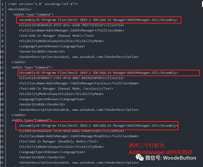 1.打开Autodesk.AddInManager.addin文件,更改成你的AddInManager.dll文件所在路径。