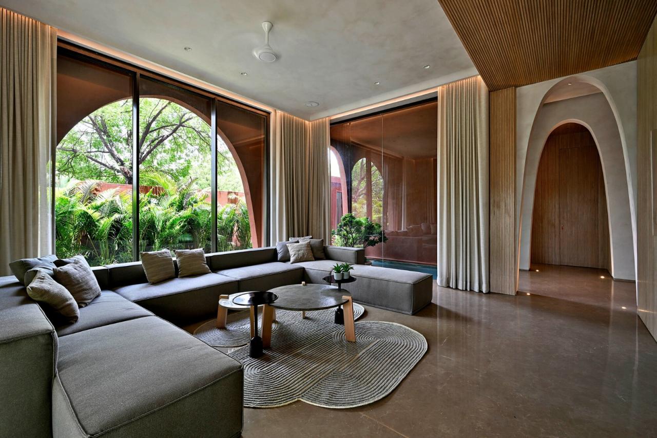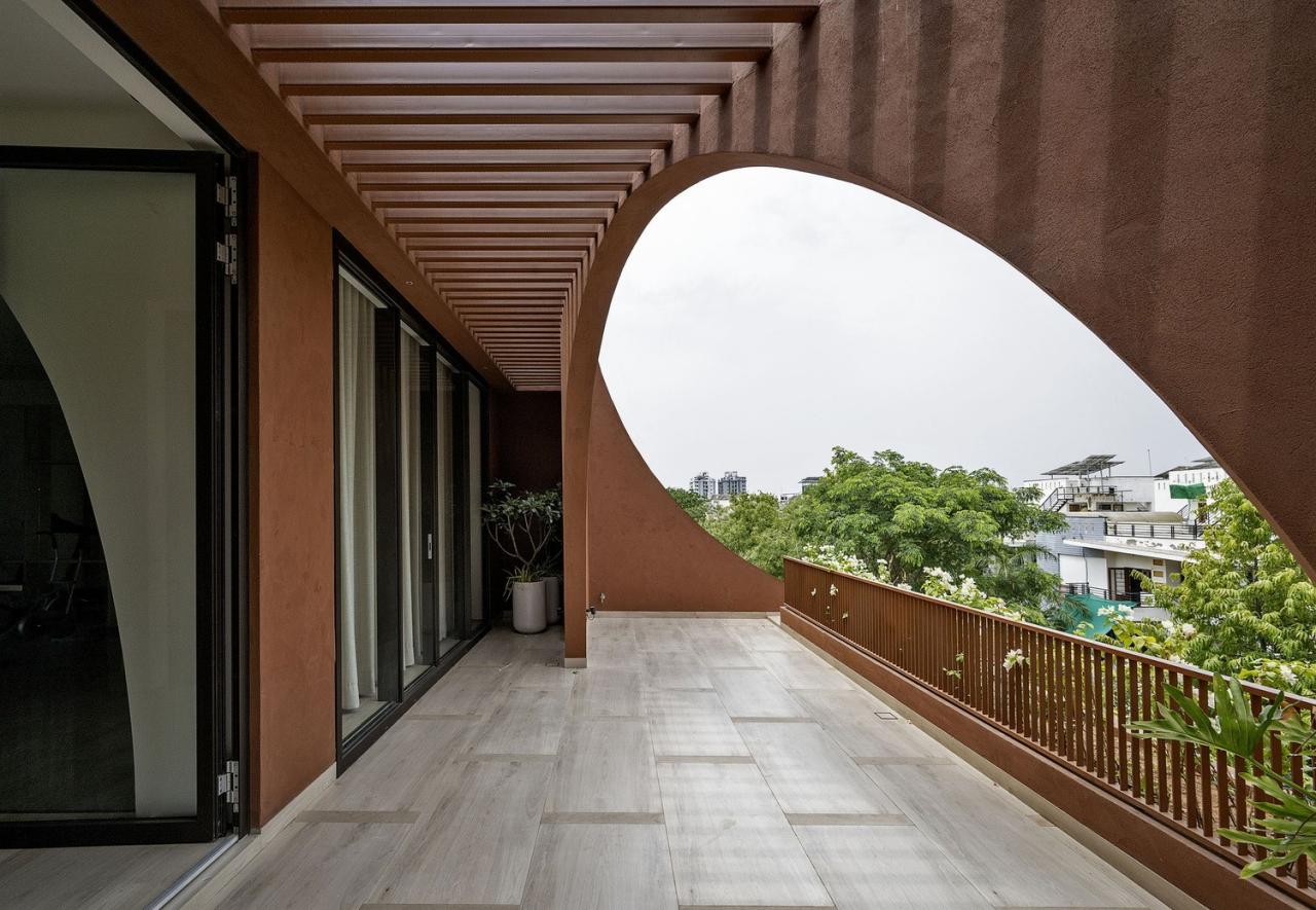设计出这种能够减少热增益的外墙结构为的是应对当地炎热干旱的气候,当炎夏来临,温度超过 40℃ 的天气长达八个月之久,而这种外墙可以使整座房子保持凉爽。这座雕塑般的住宅与当地环境、气候和业主的需求一一照应,在每一层楼都创造出了别具生趣的空间体量,和开阔的封闭式与半封闭式空间。