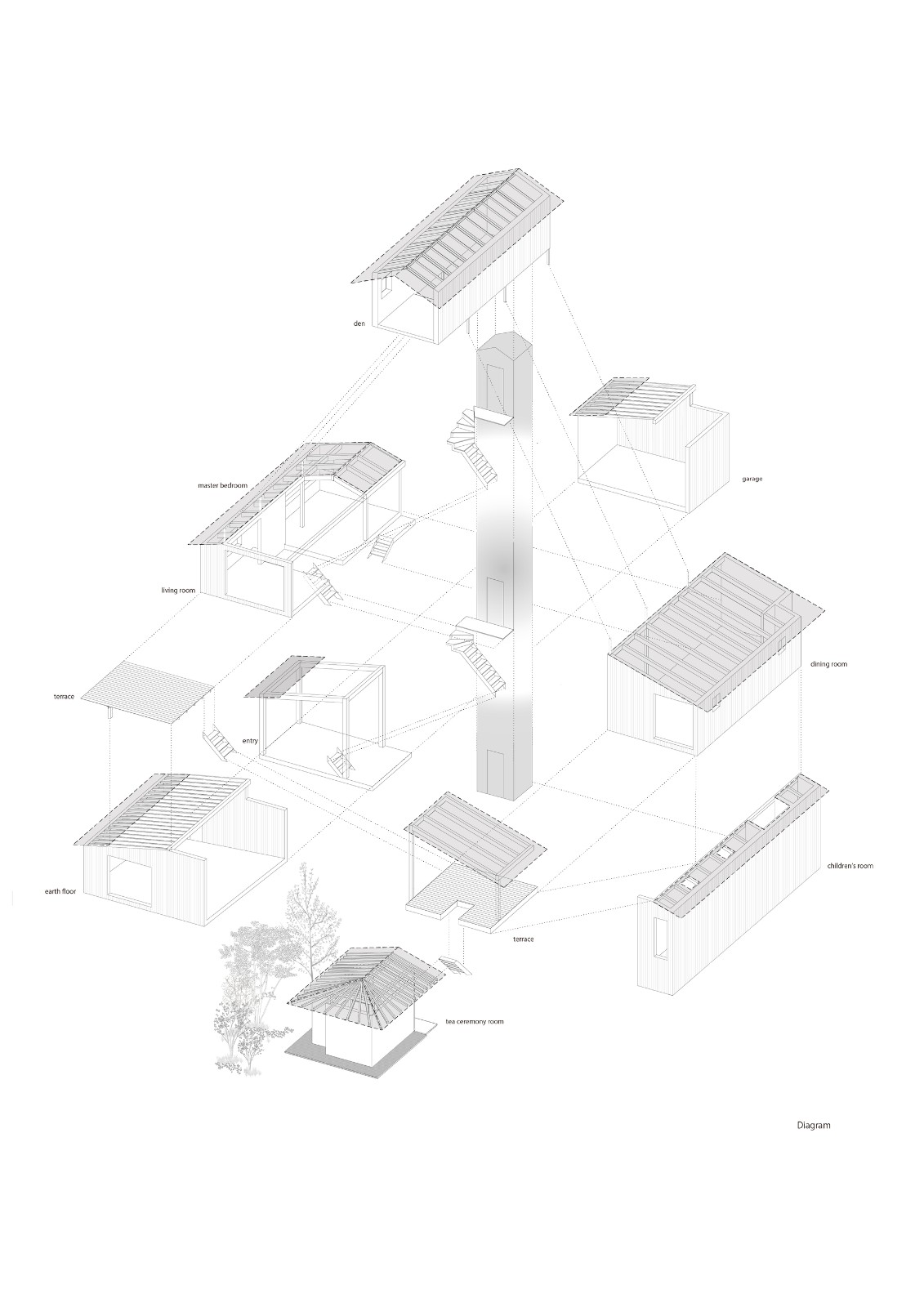 这样一来,以屋顶为特征的各个功能空间于此相互碰撞、融合与重叠,旨在创造一个拥有多种居住场景和舒适关系的私宅空间。
