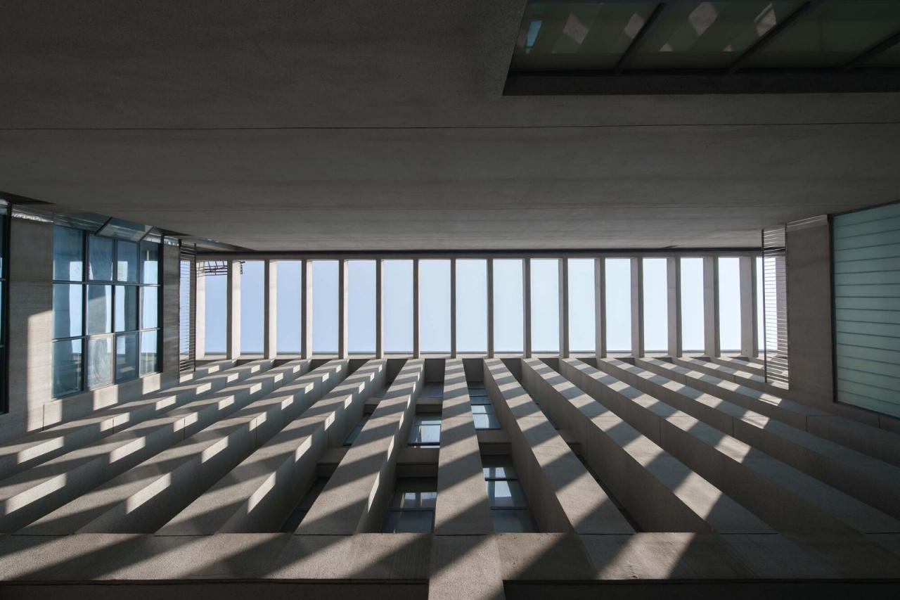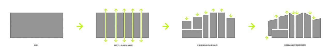 立面纵向条块在南侧保持齐平,北侧平面根据路型进行斜切和转折的变化,屋顶则通过高低起伏的折顶将几大功能体块组合成一个整体,南北立面再覆以间距、进深不等的混凝土竖向百叶,强调建筑的整体性和标志性。