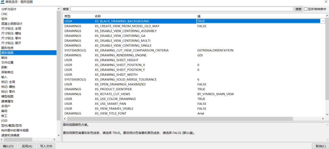 Tekla Structures21.1及之前默认图纸视图背景颜色是白色,Tekla2016及以后默认图纸视图背景颜色是白色,由于每个人的使用习惯不同,Tekla Structure设置了两种背景颜色供大家选择,可在设置—高级选项—图形视图中设置XS_BLACK_DRAWING_BACKGROUND=TRUE(默认为False),即可获得黑色图纸视图背景(需要将图纸视图全部关闭重新打开才会起作用)。