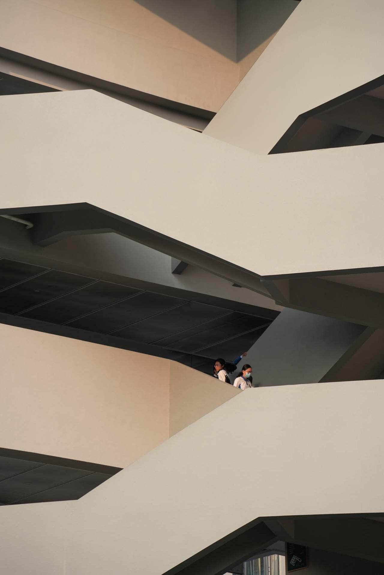 同时由于校园办学规模的扩大,为了缓解上下学瞬时交通压力,设计在校园南侧新增校园主入口,将新建建筑底层局部架空,退让出人行入口缓冲广场,形成“校园客厅”,构成了校园中轴的延续。三层通高并满足深圳地域气候特征的架空中央通廊与南侧校园客厅、北侧入口架空空间形成不同的轴线空间节点,凸显校园的主轴空间丰富性、完整性,营造校园中央廊道的场所感。另外,为了打破现状教学庭院均质、较为封闭的内部界面,在设计中通过将实体栏板改为栏杆,同时结合非正式空间节点的变化,形成了更为丰富、通透和立体的界面,提供有趣多变的视线穿越与空间体验。