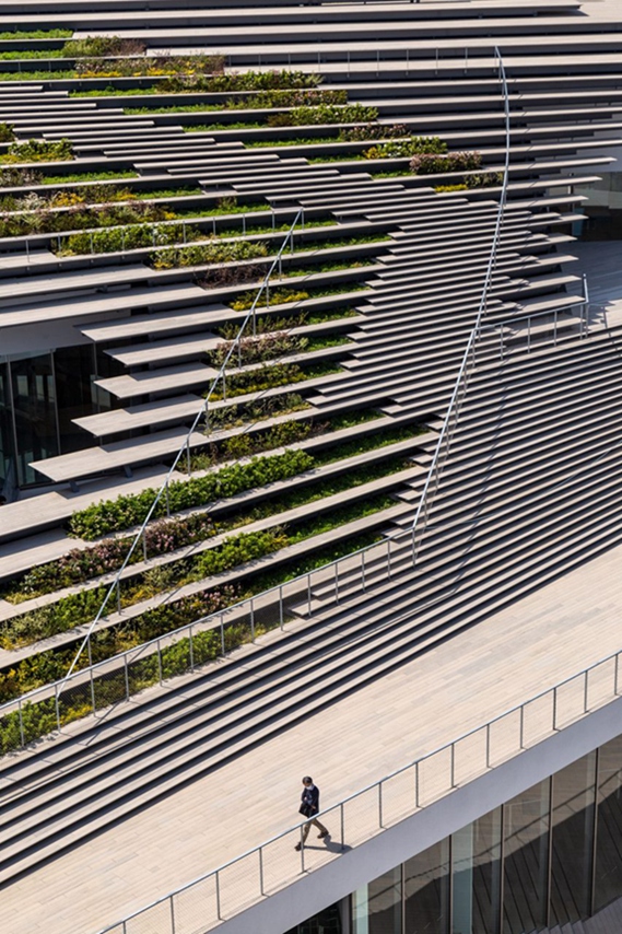倾斜的屋顶上衬着木制“看台”(bleachers)和植物,隐藏着日本隈研吾工作室(Kengo Kuma and Associates)为东京理工学院(Tokyo Institute of Technology)创建的学生中心。