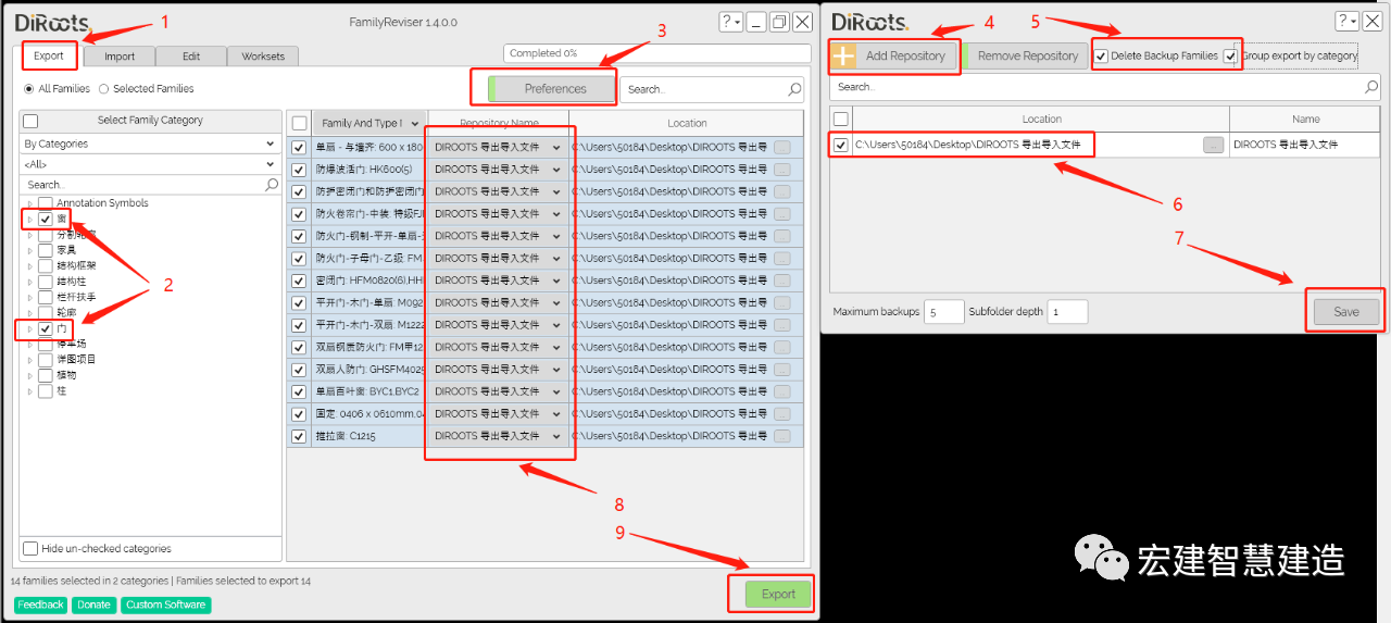 5.勾选删除备份文件和按族类别分文件夹(不需要删除可不删/按族类别分文件夹是按照门和窗各自创建门文件和窗文件)
