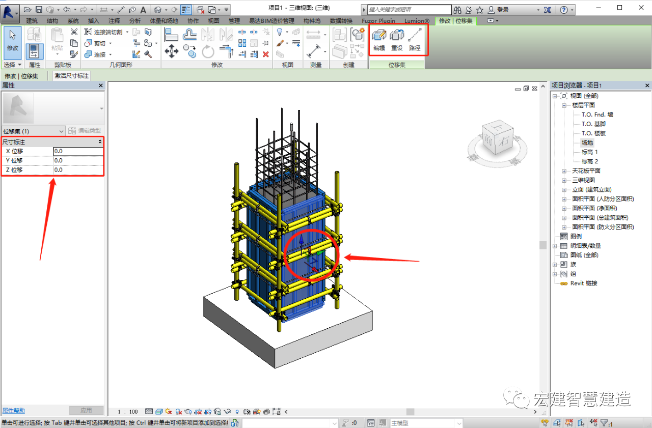 选择要炸开的构件,该构件如果是单独的则可以在菜单栏里修改选项卡下找到置换图元,点击它,这时在构件上会出现一个直角坐标系,可以根据需要来移动到合适的位置,也可以在左侧直接输入数值来控制移动,或者是给该构件添加先对应的移动路径。