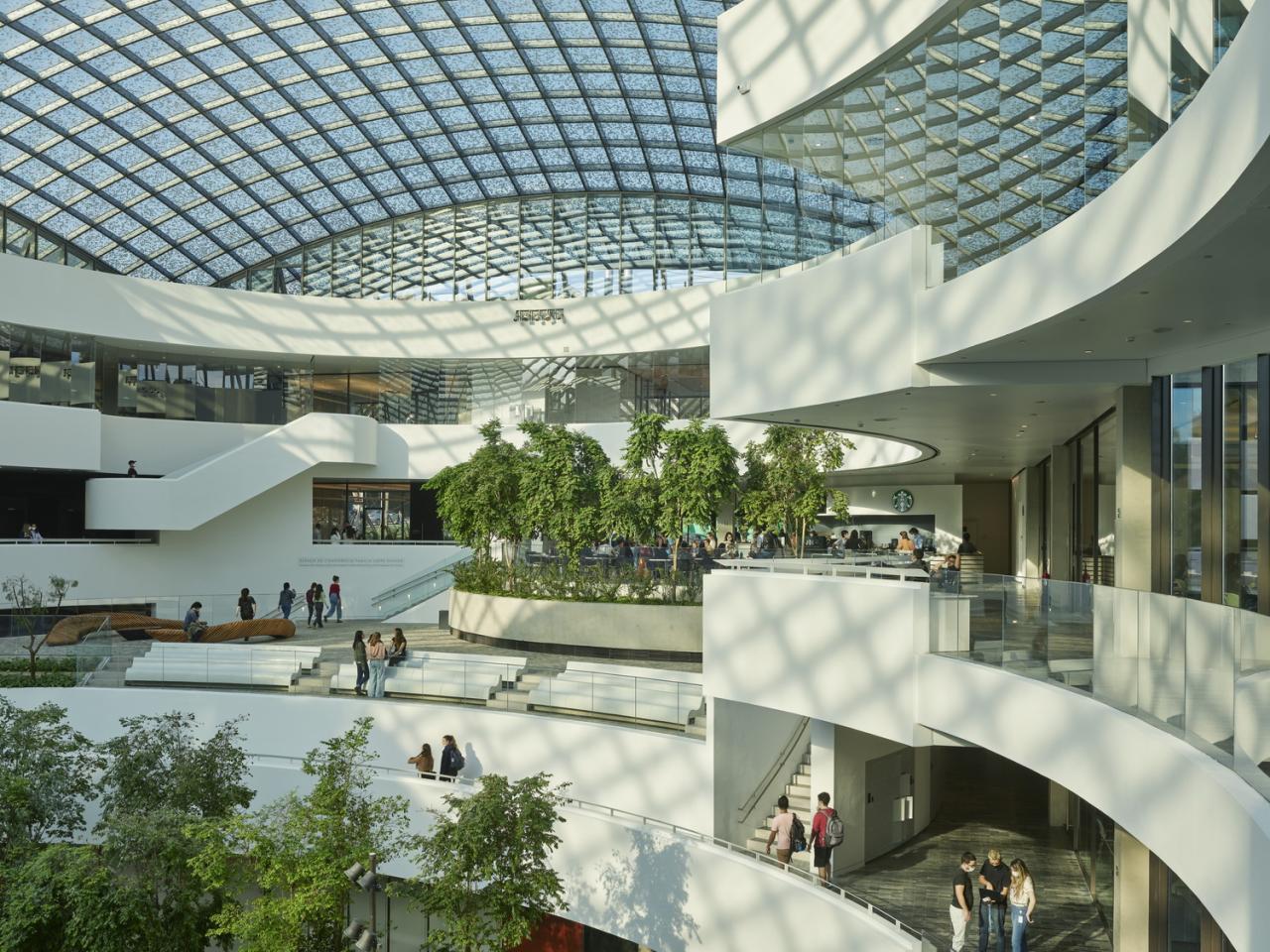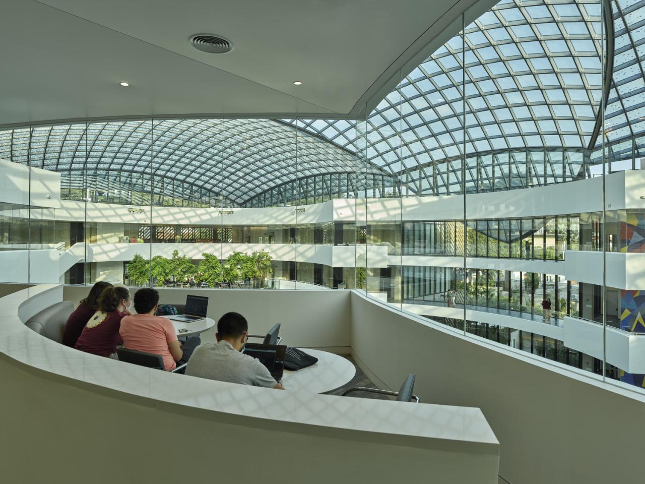 作为教育研究中心学习、协作与社群交流的核心空间,中庭花园采用了复杂的环境控制系统来维持舒适健康的环境,实现可持续发展的目标。