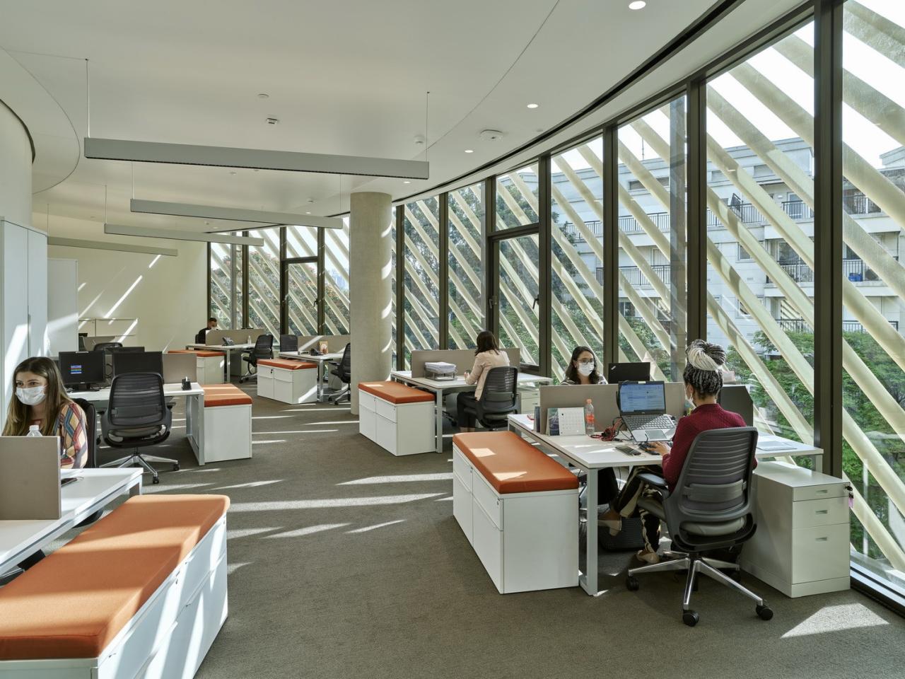 连续的通高玻璃幕墙为实验室与教室提供了充足的自然采光,而其外部的围护结构设计了两种遮阳方式——一部分楼层通过悬挑的楼板形成荫蔽;另一部分楼层则外覆遮阳百叶,在控制日照、防止眩光的同时,保留了室内望向周围的视野。