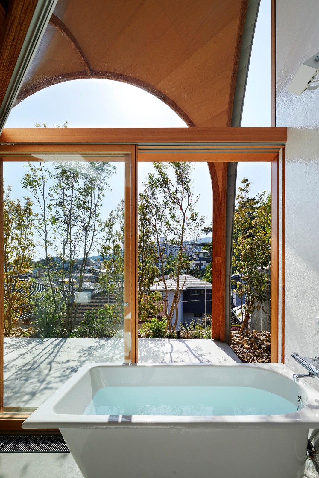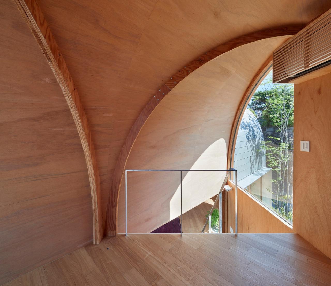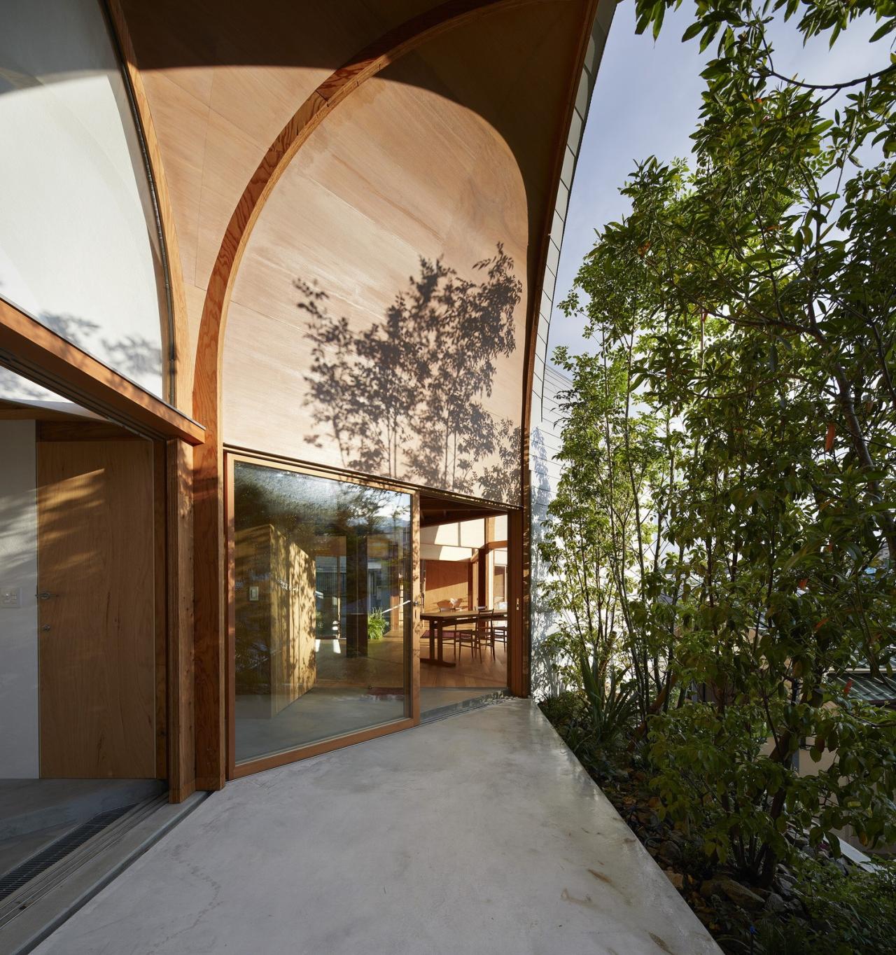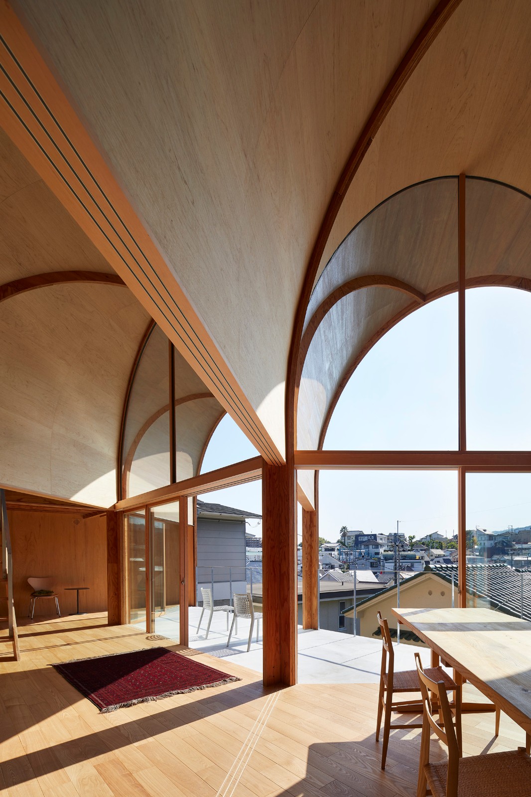 当建筑师进行场地道路查看时,他们发现仅有一条约 2 米宽的狭窄道路可以通往场地。这条道路蜿蜒曲折,不适合用于运输建筑材料。因此,建筑师首先考虑了一种可以手动运输和组装的建造方法:建筑以“拱”作为可拆分的基本模块,以此通过组合一个个小模块以构建大跨度的空间。处在因日本易地震而盛行的木构建筑文化中,建筑师也希望通过甲阳园之家的设计以探索木制模块组装是否可以替代或转换为砖石架构。