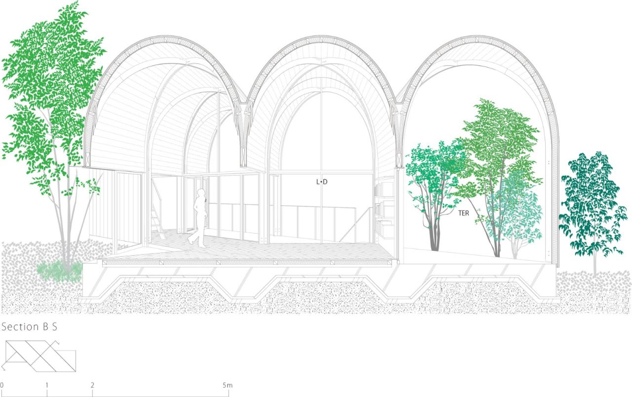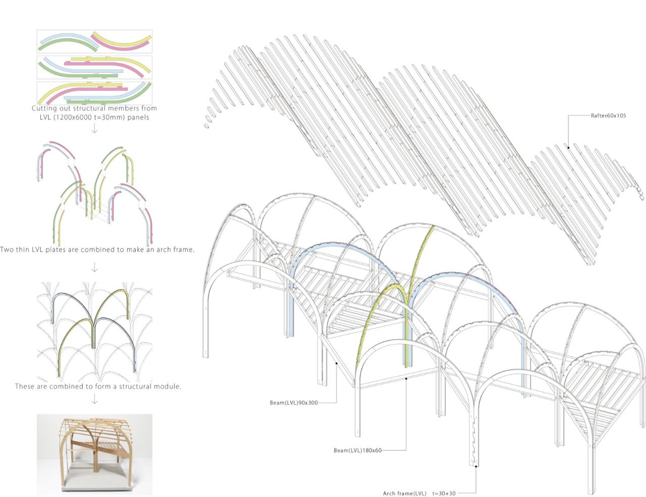 建筑所采用的的是一个较为原始的系统,其中将只有压力和张力沿着切割后木材纹理的纤维方向传动。以这种方式打造的木制拱形架构“背靠背”组合成一个个十字形平面的柱,继而发展成可延伸、可重复的建筑基础架构。