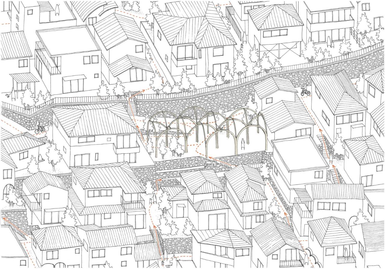 甲阳园之家是一栋位于日本兵库县的住宅,它建立在梯田般的山坡之上,场地四周环绕着复杂的挡土墙系统及蜿蜒的小道。这些小道设置在斜坡之上,因此与居住在此的人们的日常生活交织在一起。此外,场地中还包含了原有不知来历的挡土墙、以及仿佛仅可以让小动物穿行的小路,因此场地也是城市过渡空间的一部分,而过去则驻留在挡土墙与城市道路相交之处。在这种情况下,建筑师希望通过将过去与现在的街道作为设计线索,并思考一个家应该如何融入城市的流动并与之连接。建筑师认为通过这样的设计方法,住宅将与城市色彩融合,住户所能感知的空间也不再只局限于单个建筑之中:其感知将可以拓展至整个城市肌理之中、与其连接。