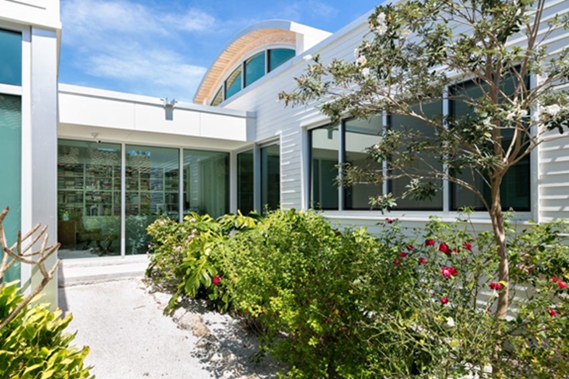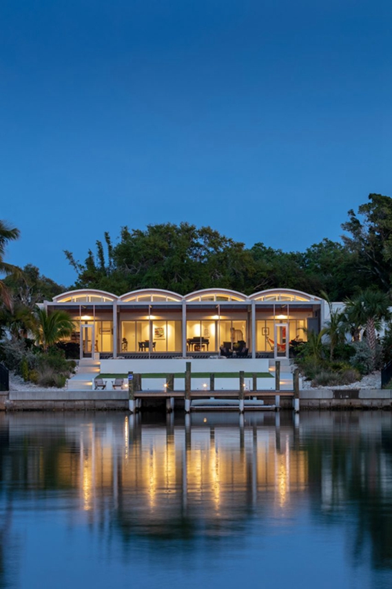 塞伯特建筑工作室(Seibert Architects)也位于萨拉索塔(Sarasota),它表示:“泳池区和滨水庭院都是露台,为滨水活动、儿童玩耍提供了平坦的户外空间,并便于向下过渡到水里。”进入住宅的入口通向一个郁郁葱葱的庭院。这个由玻璃墙围成的外部空间为建筑带来了光线,也为业主和孩子们提供了一个玩耍的空间。