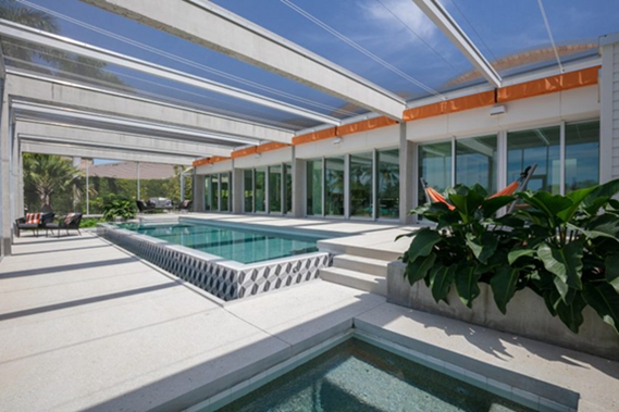 房子的西面正面是高高的滑动玻璃门,通往泳池平台。这个室外空间由一个大的可伸缩遮阳篷和一个屏蔽外壳遮蔽,以保护用户免受强烈的阳光直射和昆虫的伤害。