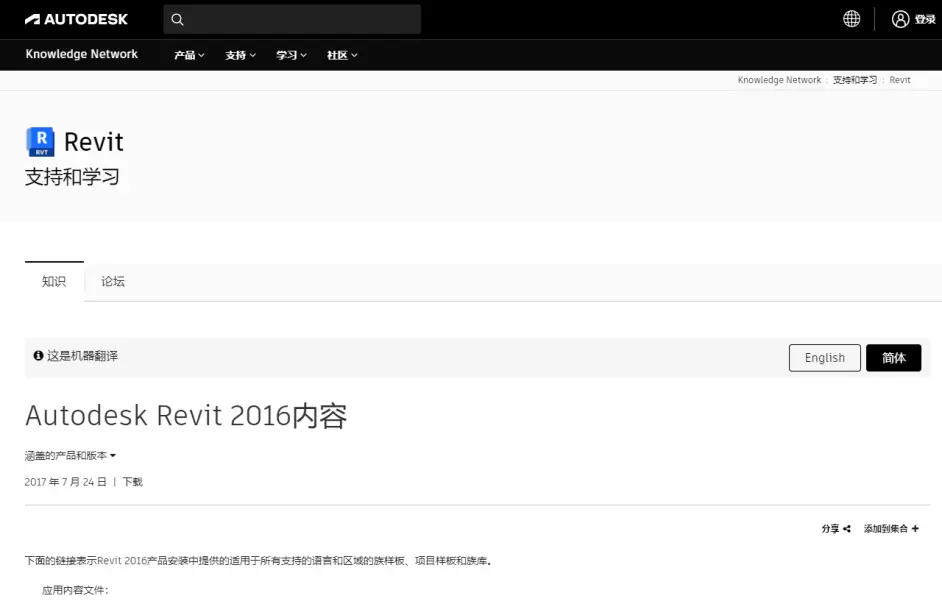 进入网站后,根据自己电脑所安装的Revit版本,这里以Revit 2016版为例,点击上图中的·Autodesk Revit 2016 Content,进入以下截图的网页: