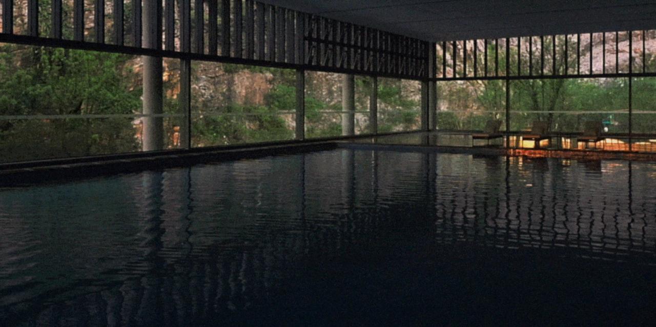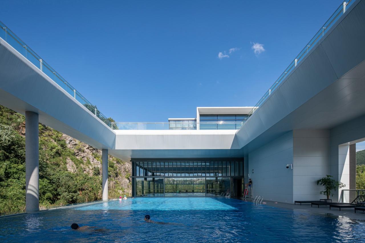 建筑被视作收纳景色的“容器”。位于二层的游泳池被设想为一个悬浮的盒子,嵌于建筑体量之中,构成入口的鲜明形象。泳池分为室内与室外两区,连成一片近50米长的深远水面。为强化通透感,室内泳池区的水面标高以上皆为玻璃面,6米宽的玻璃单元以悬吊外框的方式固定,最大程度上保证游泳者获得“无阻碍”的观景视线。