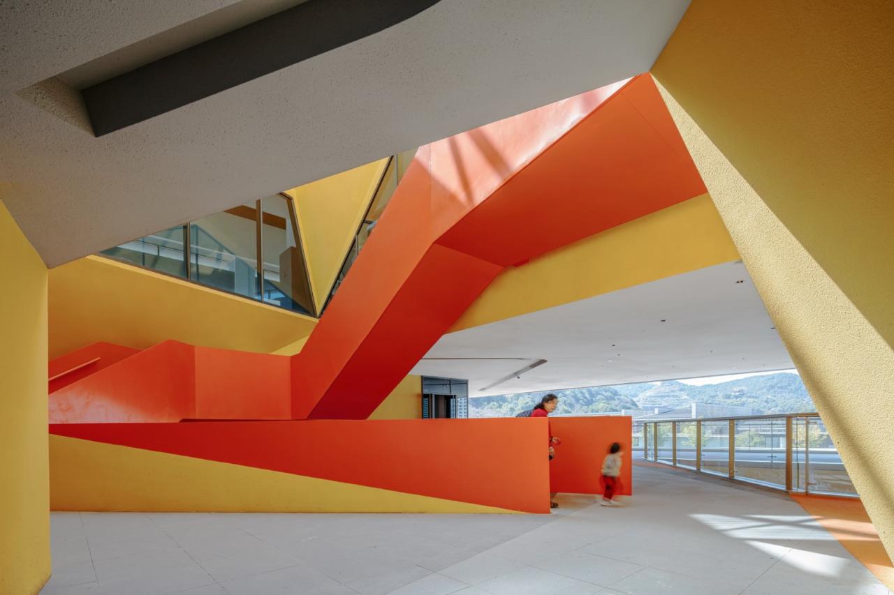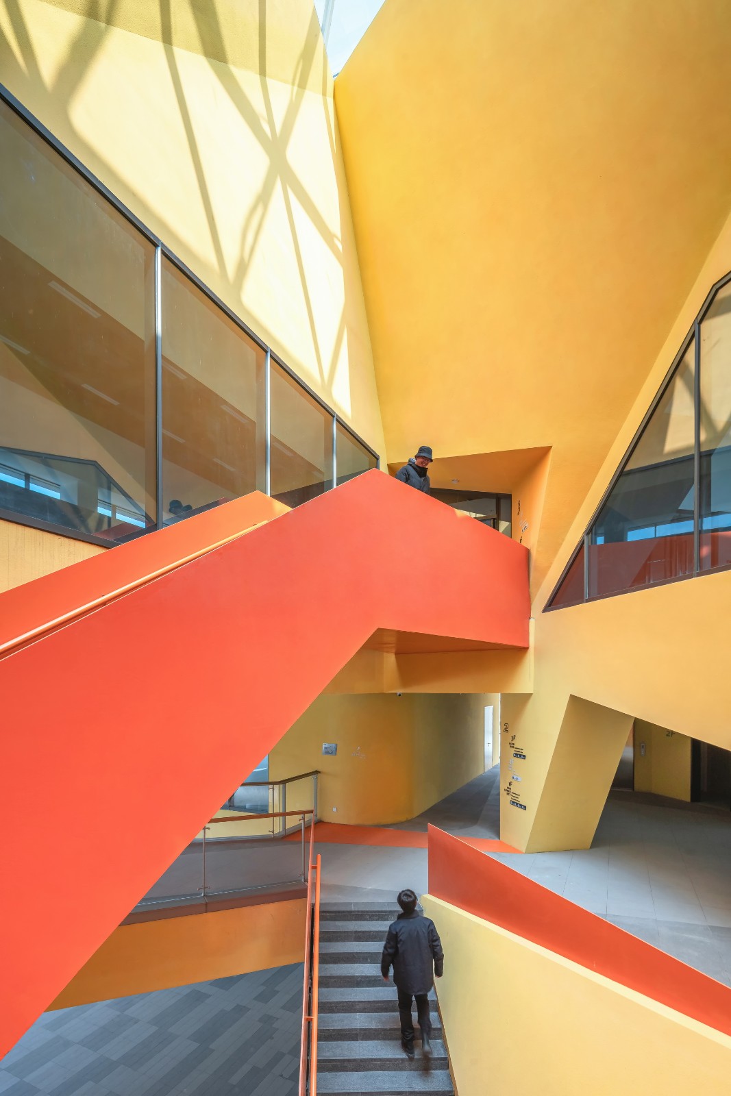建筑师通过色彩、光线的设计,塑造中庭的活力与戏剧性。活泼的橘黄色系如同生长出的枝桠,从中庭延续至整座建筑的公共空间,包括入口的大台阶、露台、底层架空空间。它们与建筑外表的暖灰色调形成强烈对比,吸引街道上漫步的人群往里窥探一二。