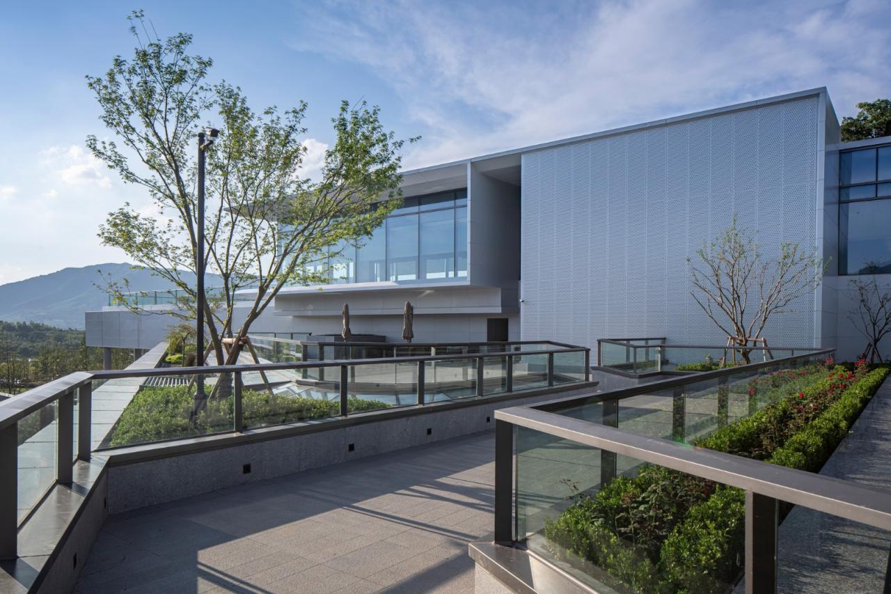 建筑师意图使场馆与自然山景相融合。一组宽大的室外平台将场馆与山体、道路相衔接。曲线形式的平台如同套在场馆体量上的蜿蜒绸带,既解决了流线问题,又提供了多角度的观山视角,为底层带来丰富的灰空间。