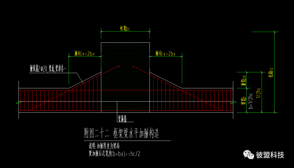 在结构设计过程中,常常会碰到梁中心线与柱中心线偏差较大的情况,设计师在设计过程中就需要在梁柱节点处增加水平加腋,保证梁柱中心线不能重合时,梁偏心对梁柱节点核心区的不利影响。