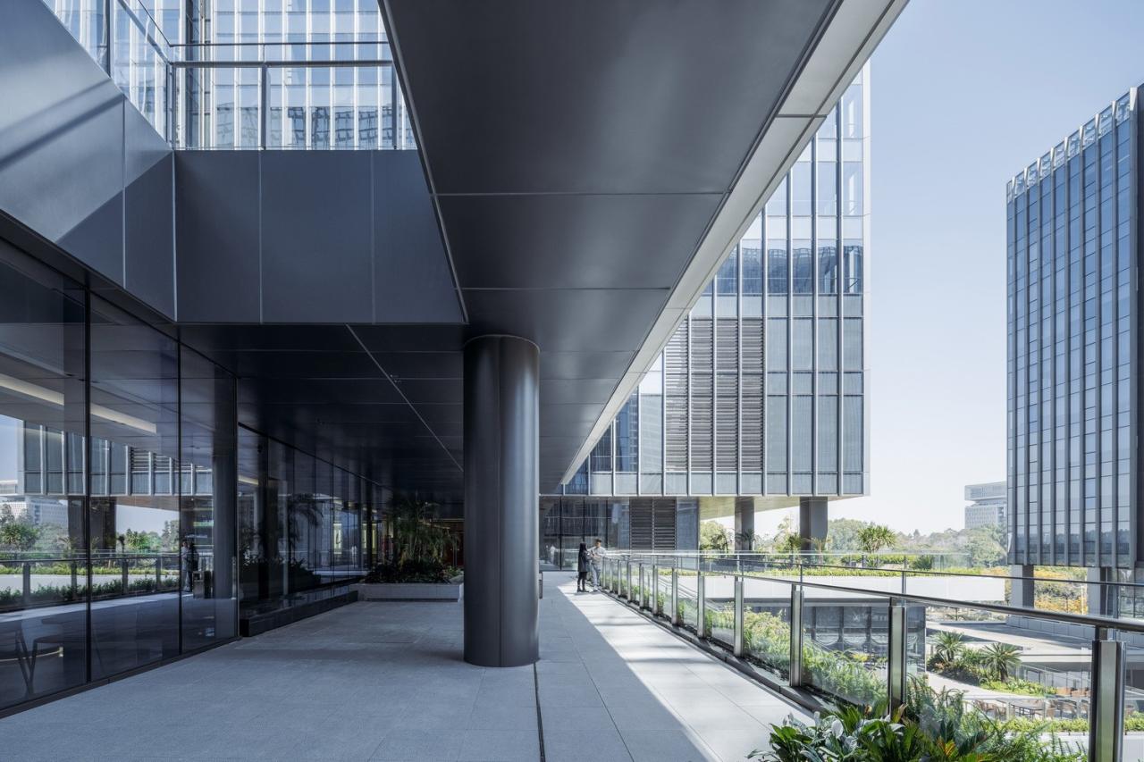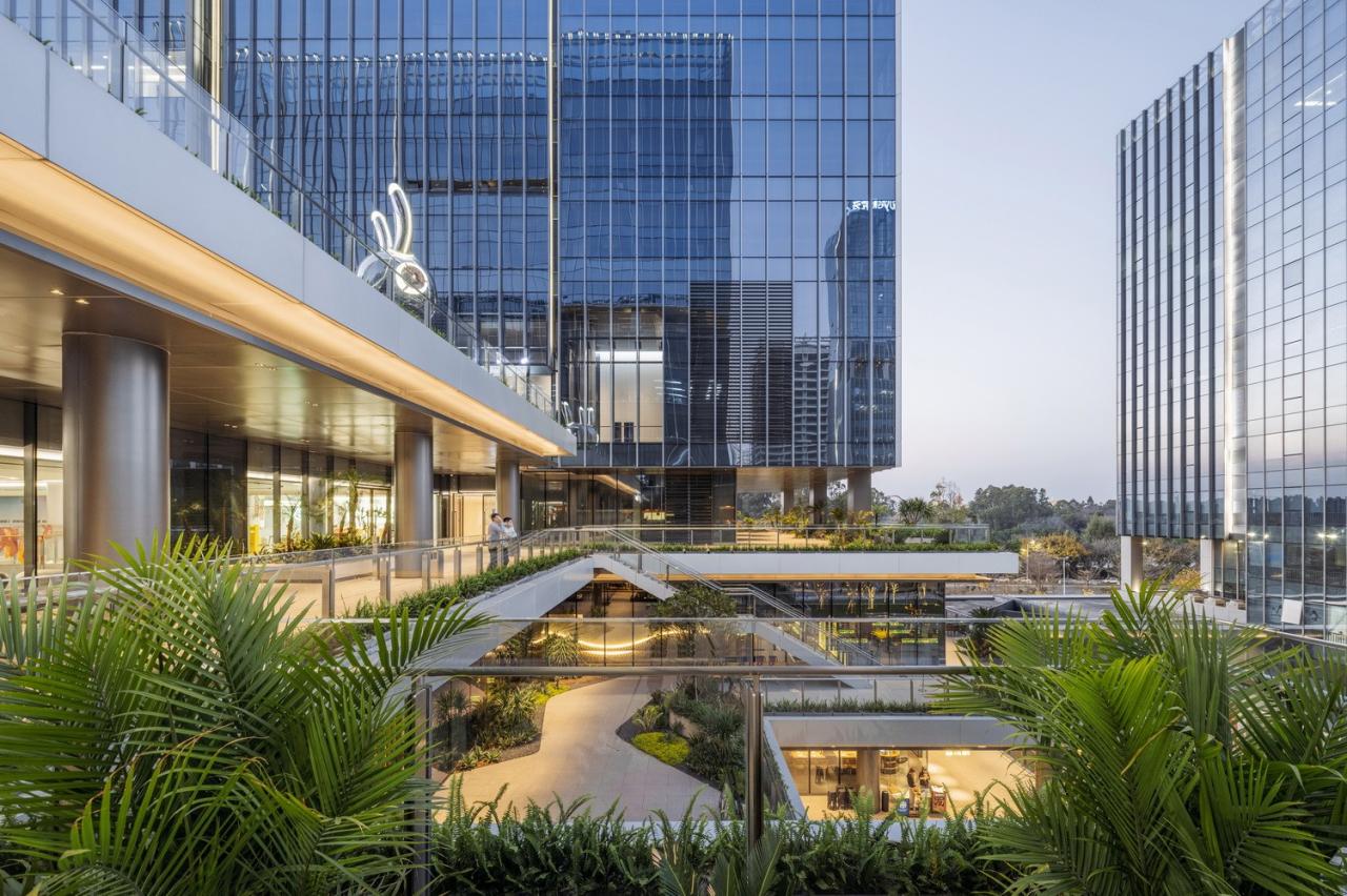 办公部分满溢着大量的植被露台、花坛小景等共享式的绿色建筑景观。这些错落有致的露台走道在内部是工作区间的轻松连接,向外则是商业层次的自然渗透与延伸。多维展开的景观平台灵感源自于岭南的丘陵、梯田等地形地貌,让绿意流淌其间,也以软性的手法模糊了城市、自然与建筑的界限。层层退进的露台结合岭南气候特征的热带植物,为用户创造回归自然的“市集”体验。