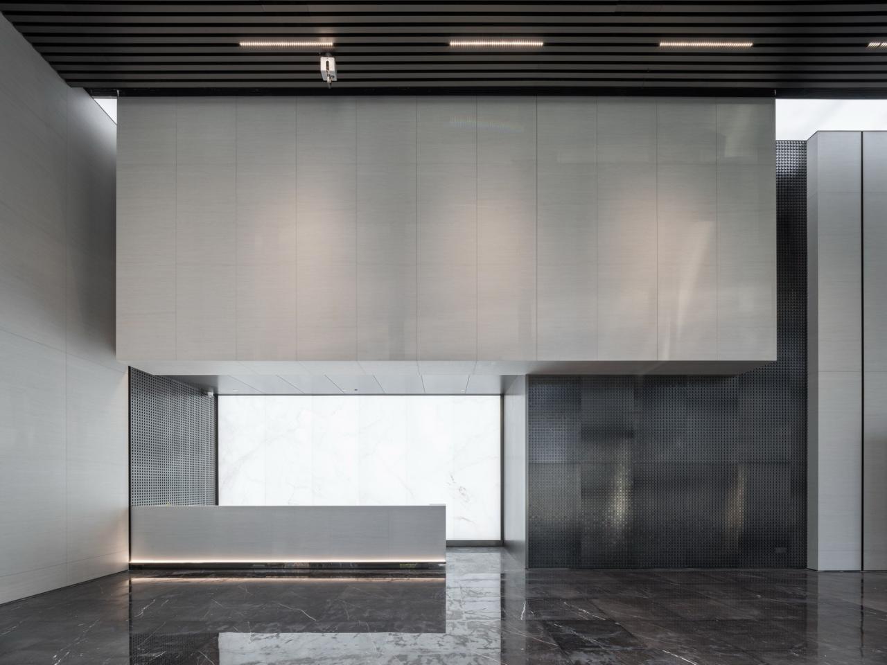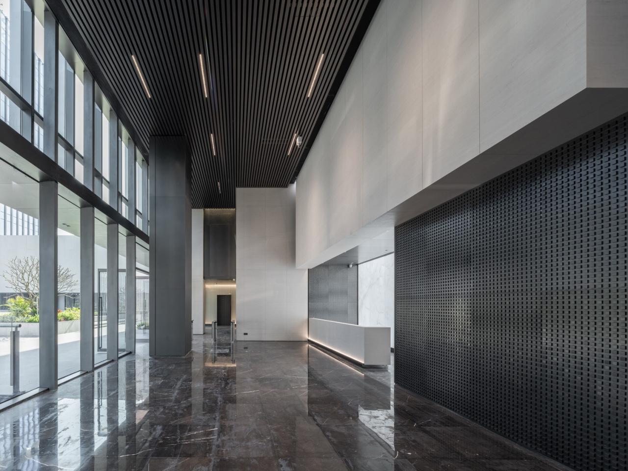 设计选择让城市界面与办公塔楼的部分体量垒砌交错,以多元化的材质、尺度、错落进退,形成小体量的有机形态,在消解了矩形大体块压抑感的同时,也形成立面整体效果的均衡与统一。