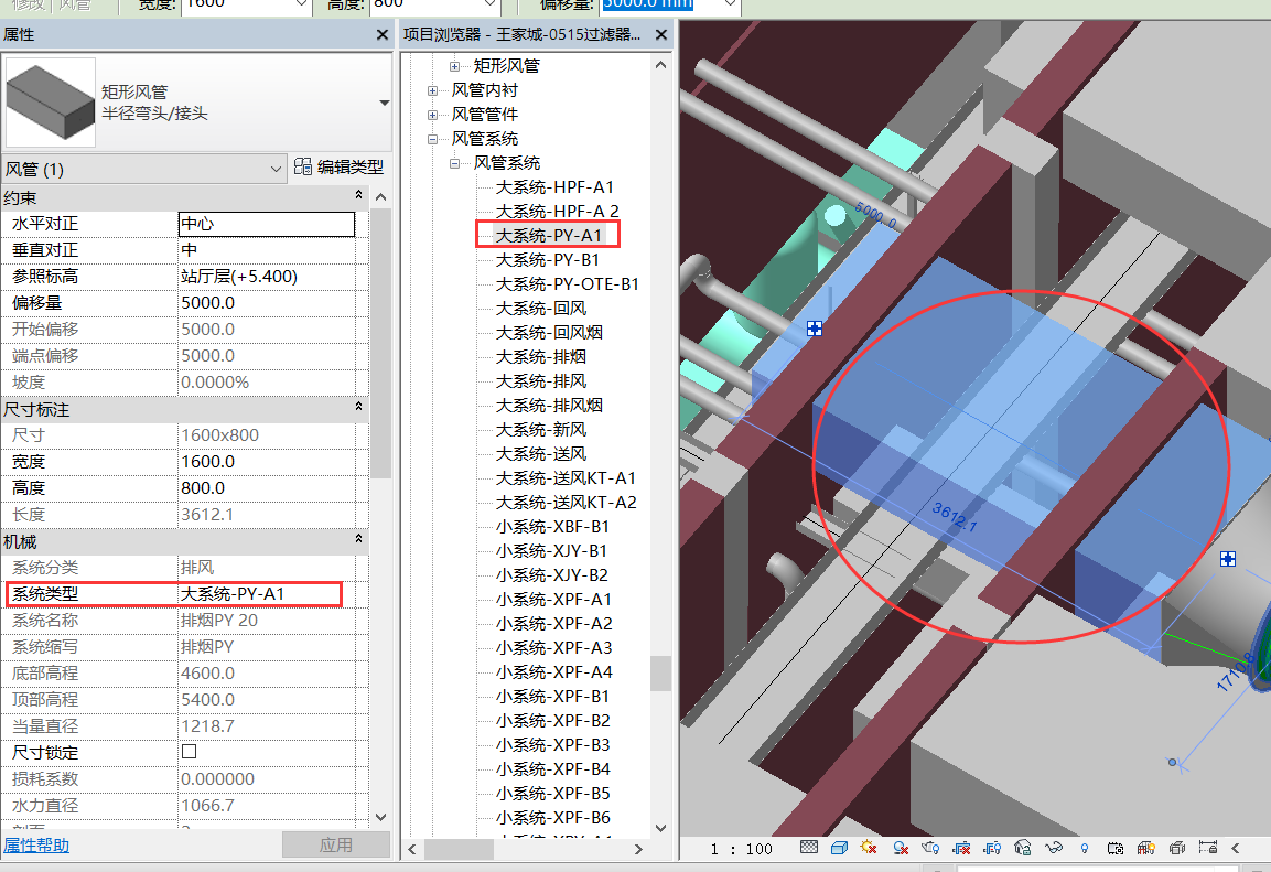 1、在风管建模之初,就需要对风管进行系统类型的划分和选择。如某根风管是属于大系统的,某根又是小系统风管。还要从风专业设计图纸中找到详细的风机编号来命名这一根风管。如下图选中的风管就是大系统排烟风管A1,在风管系统(水管则为管道系统)中命名为“大系统-PY-A1”。风管建模时,系统类型也要选择相应名字。其余所有类型风管和水管同理。