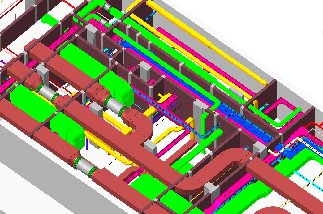 在REVIT建模界面中,无论是二维平面视图还是三维视图,我们建立风管、水管、桥架等管线,一般画出来都默认为一种灰色管线,渐渐随着管线一根根的逐渐画下去,灰色的管子就越来越多,到后来,各个专业的管子都是同一种灰色堆积在屏幕上难以区分了(如下图)。