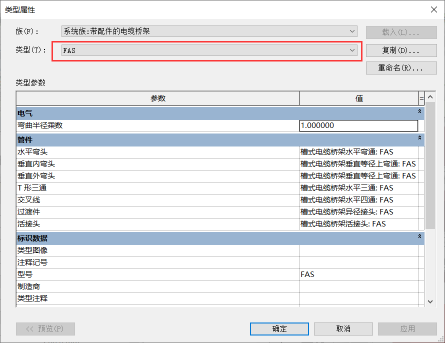 1、与上面的风管和水管不同,桥架的建模是初始时候在桥架的类型属性里面复制一个新的桥架,并重命名,比如FAS。